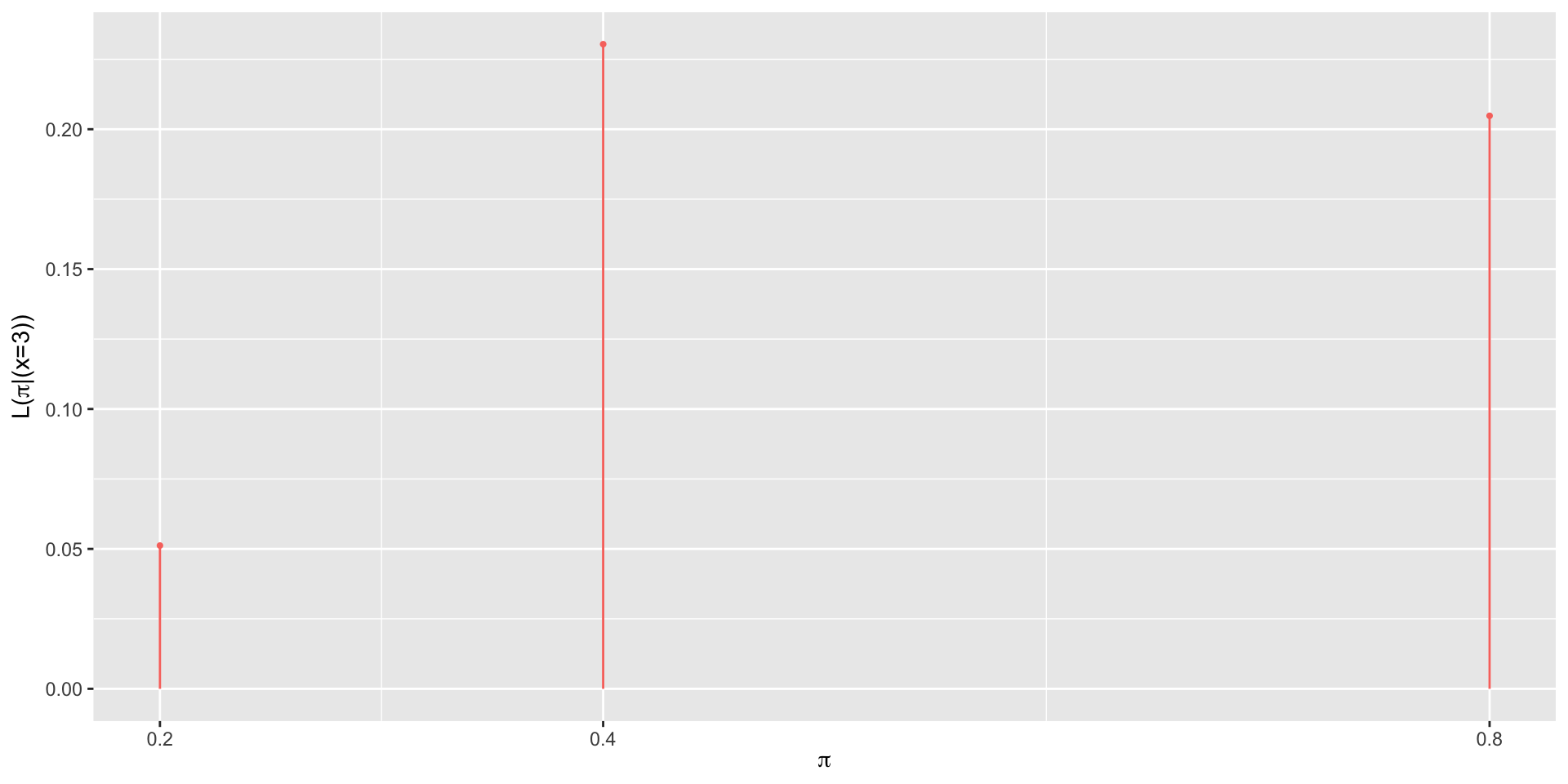 \(f(\pi=0.4 | y = 3) = \frac{f(\pi)L(\pi|y =3)}{f(y = 3)}\)