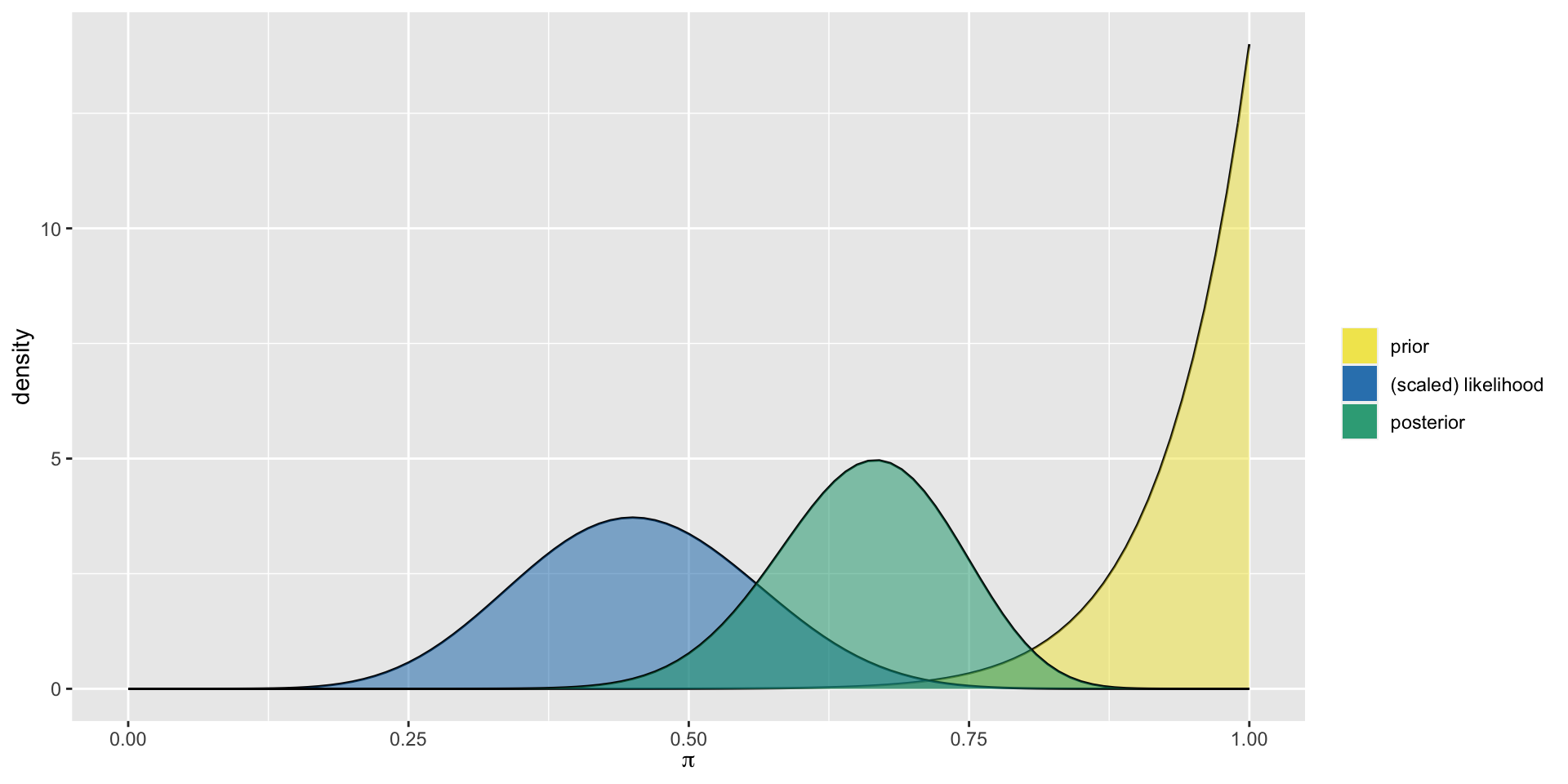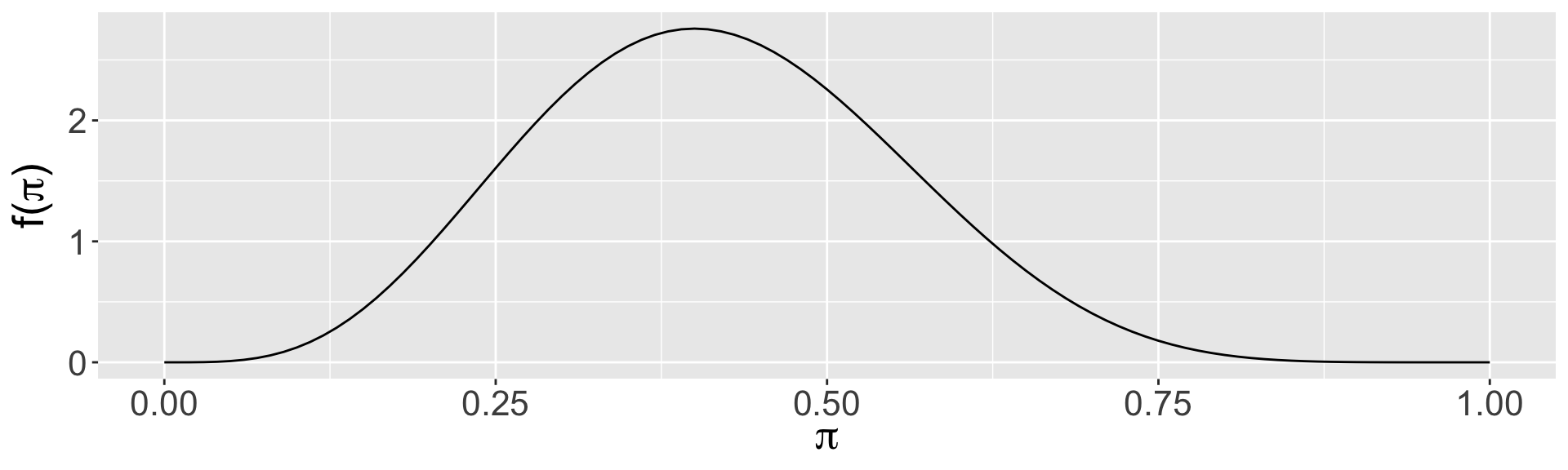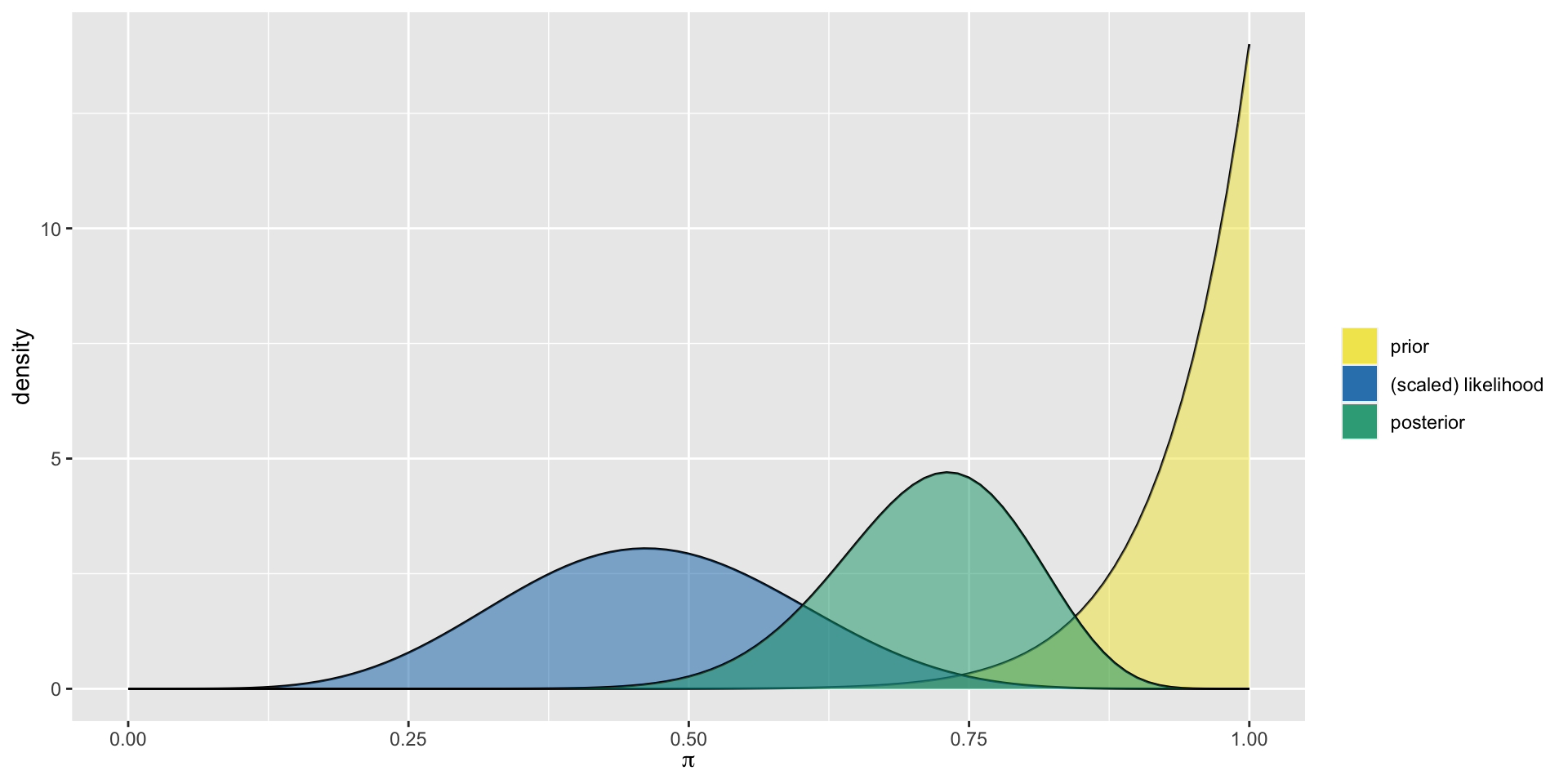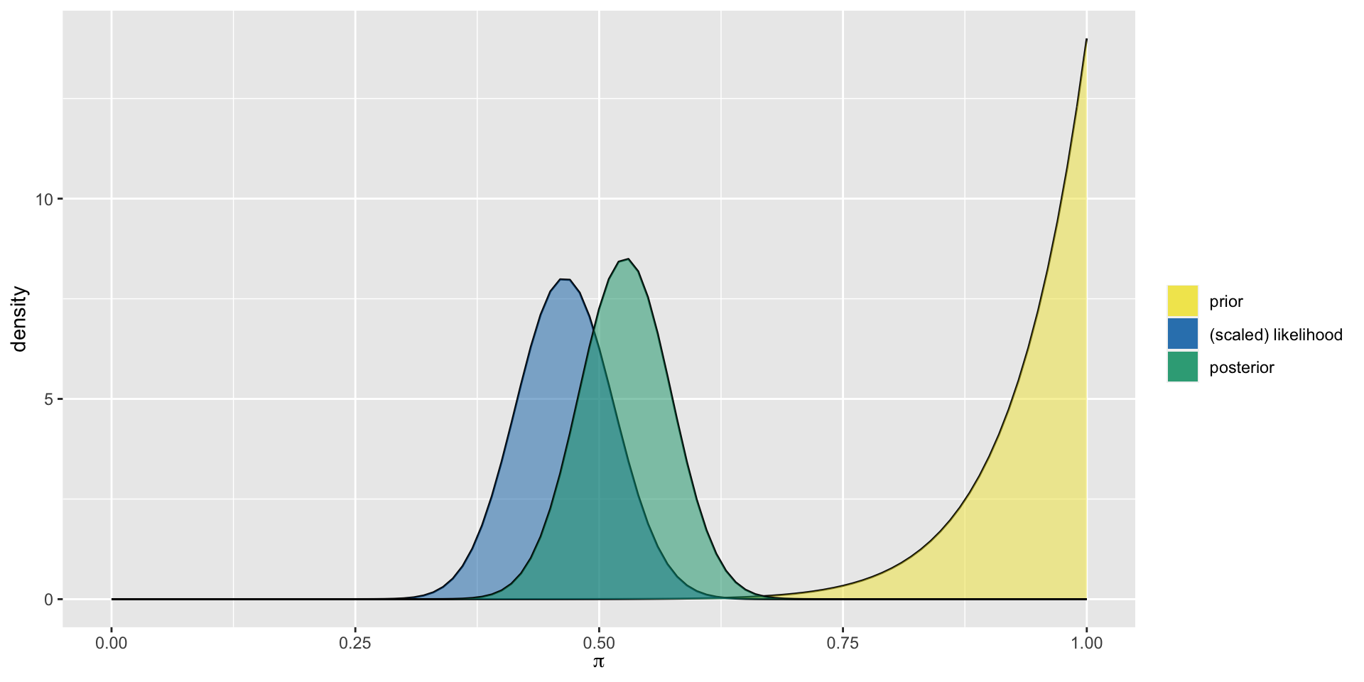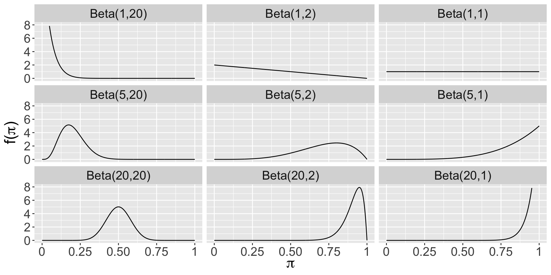 Note that in the likelihood, \(\pi\) is raised to the power of the number of successes, and \(1-\pi\) is raised to the power of the number of failures. The prior has a similar structure, and \(\alpha\) is often interpreted as the approximate prior number of successes, and \(\beta\) is often interpreted as the approximate prior number of failures, with \(\alpha+\beta\) as the approximate prior sample size.