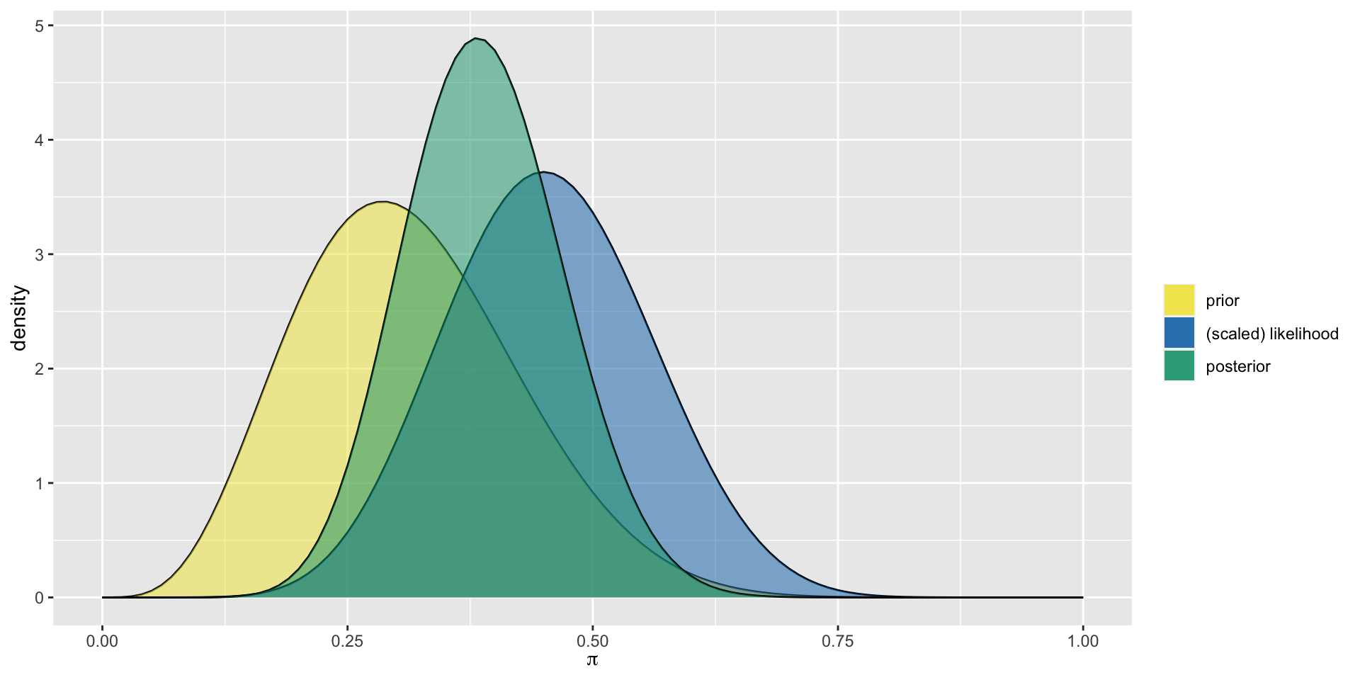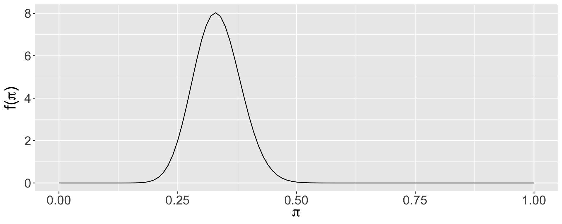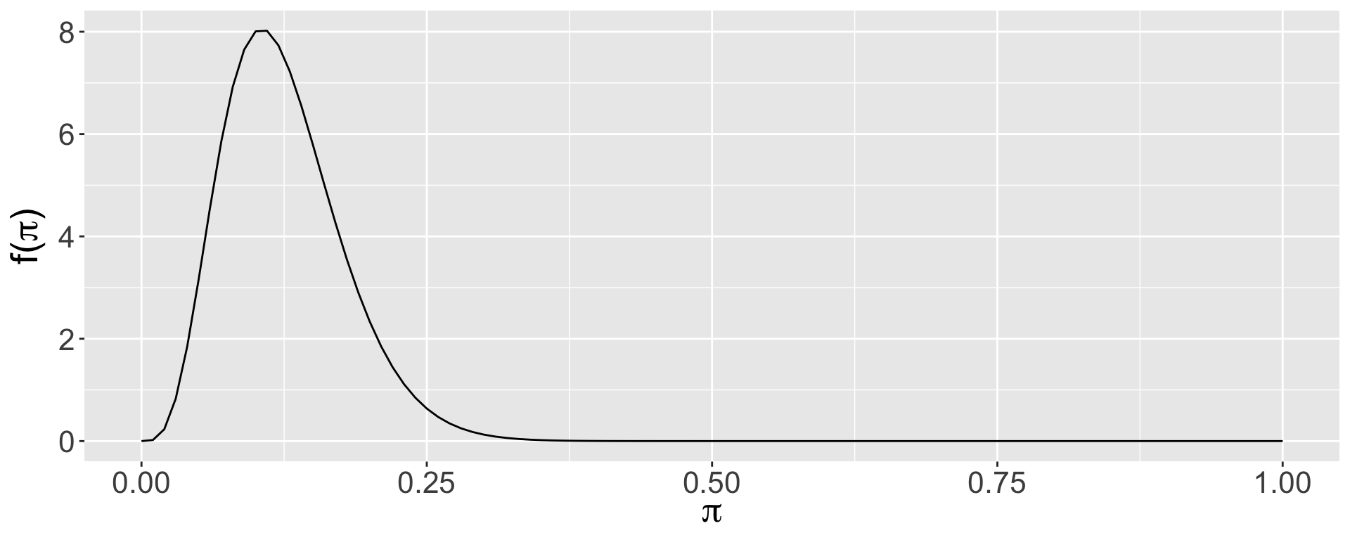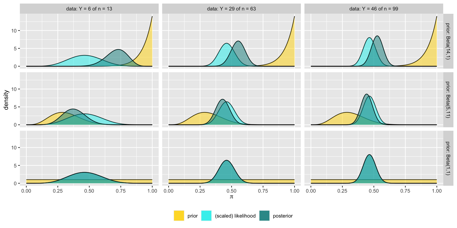 Note that in the likelihood, \(\pi\) is raised to the power of the number of successes, and \(1-\pi\) is raised to the power of the number of failures. The prior has a similar structure, and \(\alpha\) is often interpreted as the approximate prior number of successes, and \(\beta\) is often interpreted as the approximate prior number of failures, with \(\alpha+\beta\) as the approximate prior sample size.