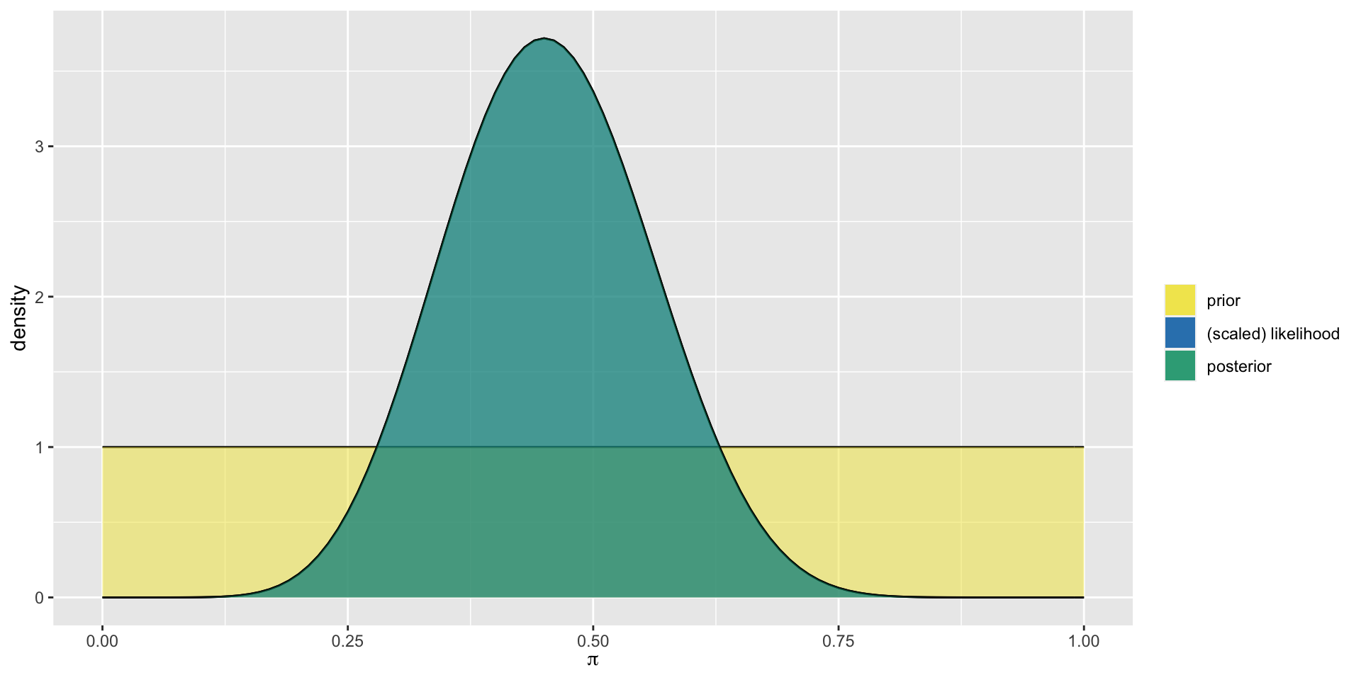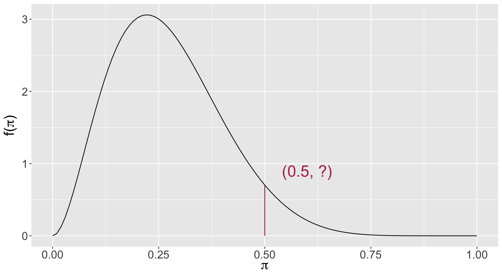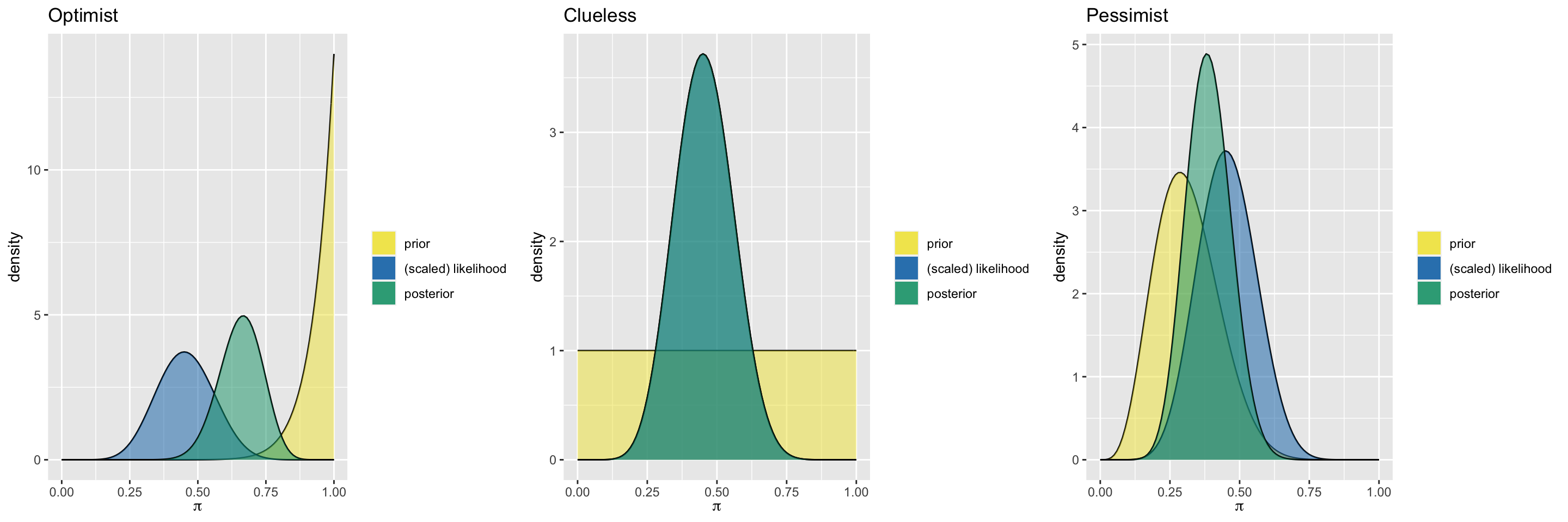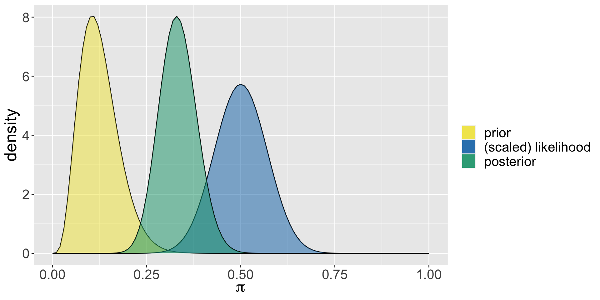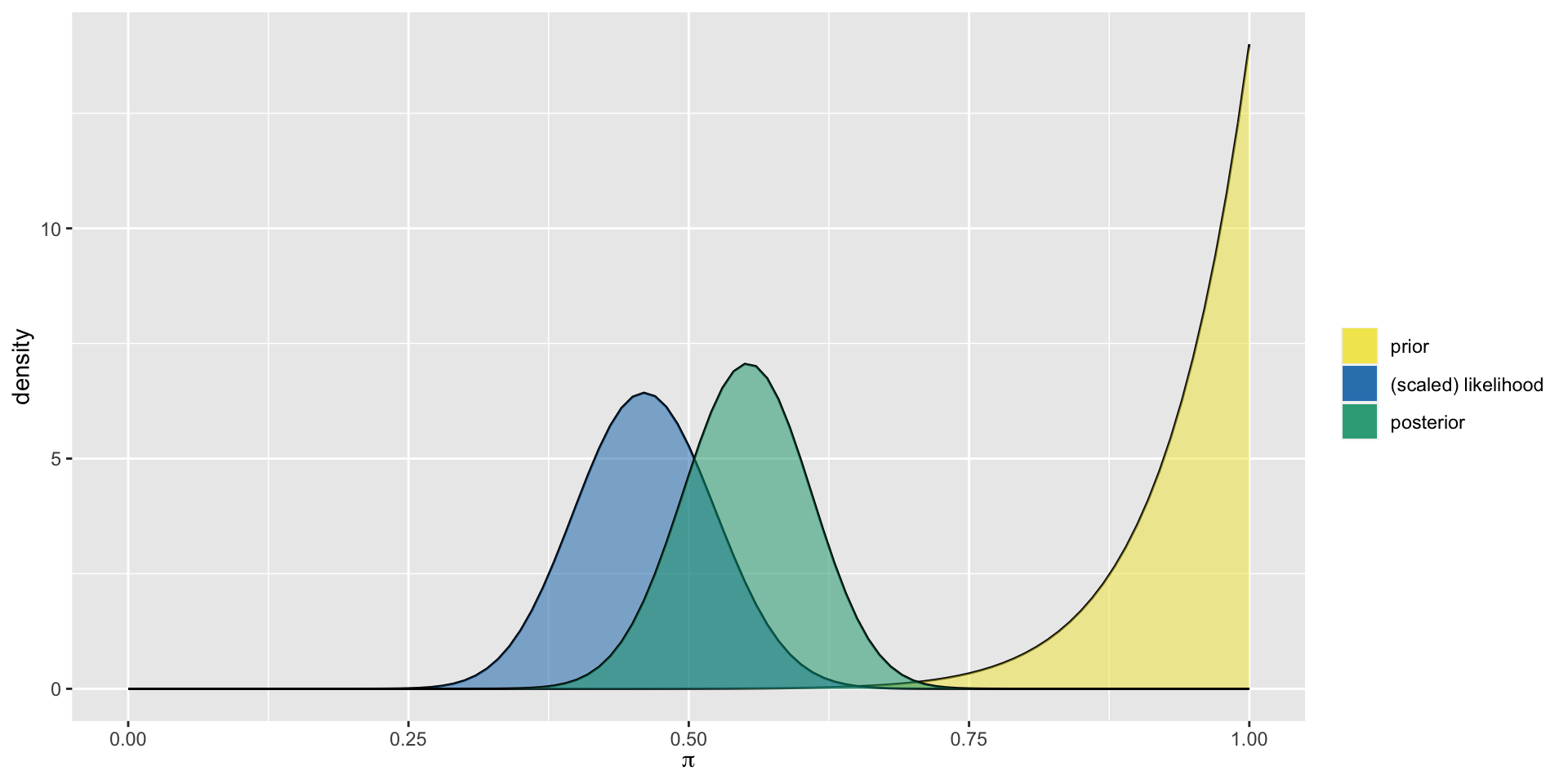 Note that in the likelihood, \(\pi\) is raised to the power of the number of successes, and \(1-\pi\) is raised to the power of the number of failures. The prior has a similar structure, and \(\alpha\) is often interpreted as the approximate prior number of successes, and \(\beta\) is often interpreted as the approximate prior number of failures, with \(\alpha+\beta\) as the approximate prior sample size.