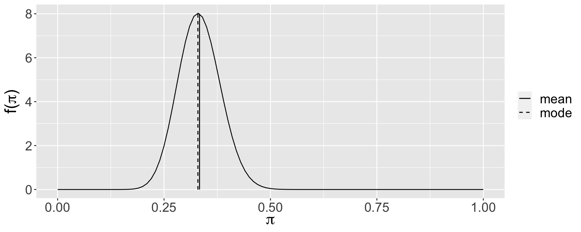 \[E(\pi | (Y=y)) = \frac{\alpha + y}{\alpha + \beta + n}\] \[\text{Mode}(\pi | (Y=y)) = \frac{\alpha + y - 1}{\alpha + \beta + n - 2} \] \[\text{Var}(\pi | (Y=y)) = \frac{(\alpha + y)(\beta + n - y)}{(\alpha + \beta + n)^2(\alpha + \beta + n + 1)}\\\]