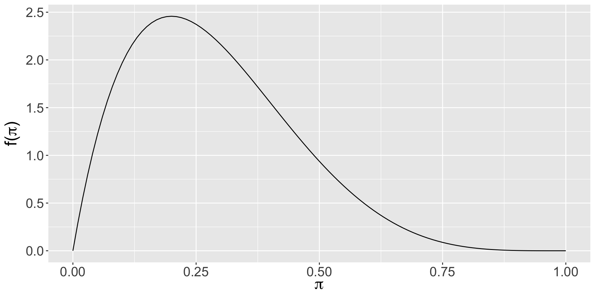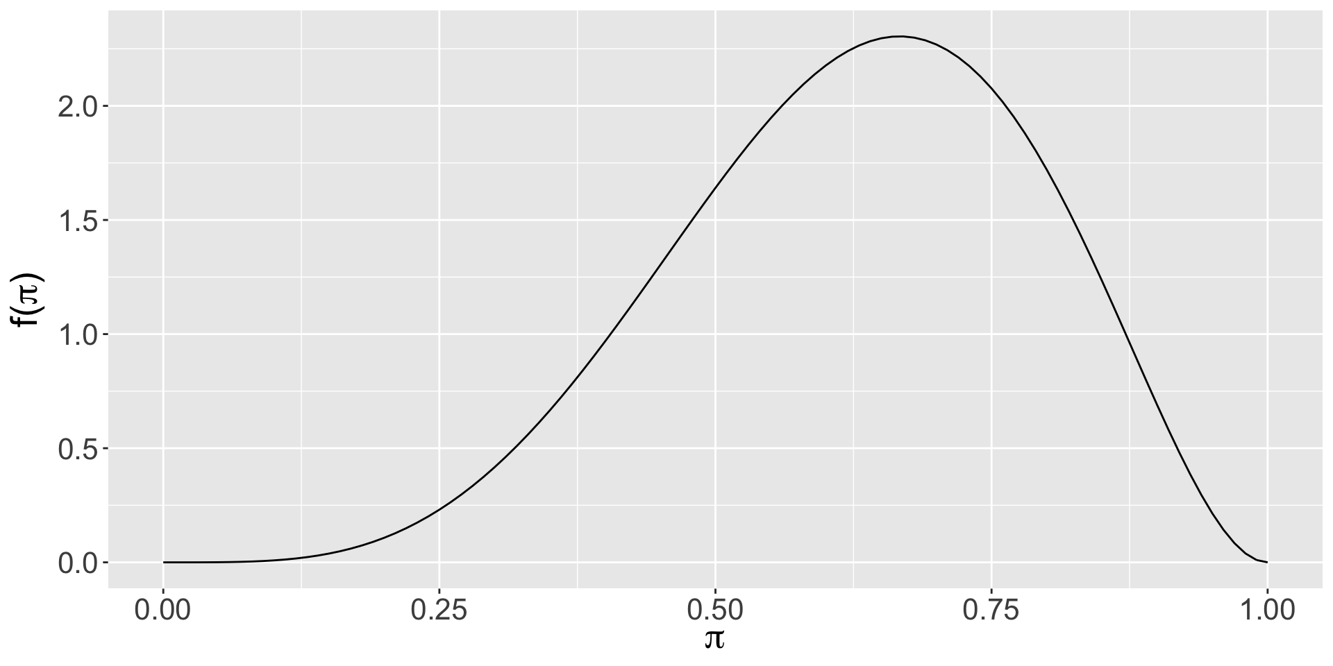 \(f(\pi) = \frac{\Gamma(3 + 11)}{\Gamma(3)\Gamma(8)} 0.5^{3-1} (1-0.5)^{8-1}\)