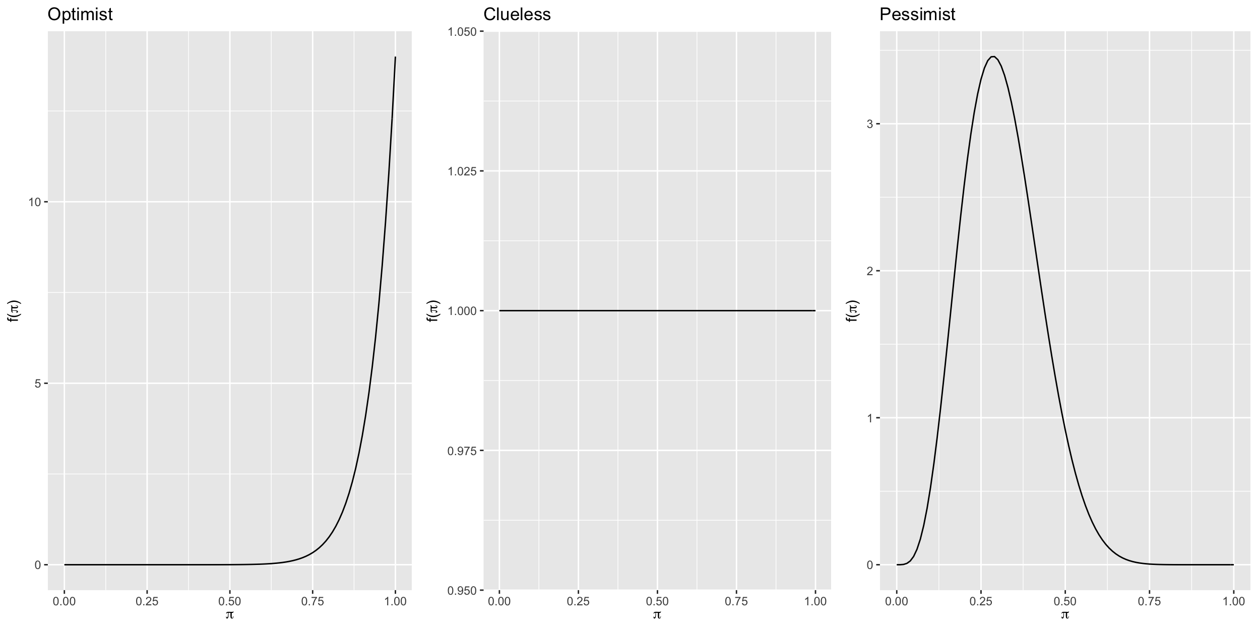 For each of the following students’ prior ideas for \(\pi\), we plot the pdf of a prior.