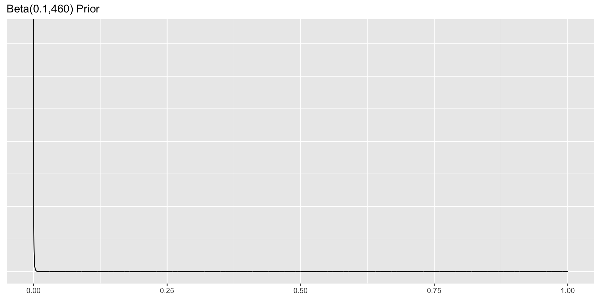 Most of the prior mass is very close to zero (mean \(\frac{\alpha}{\beta}=\frac{0.1}{460+0.1}=0.0002\)).