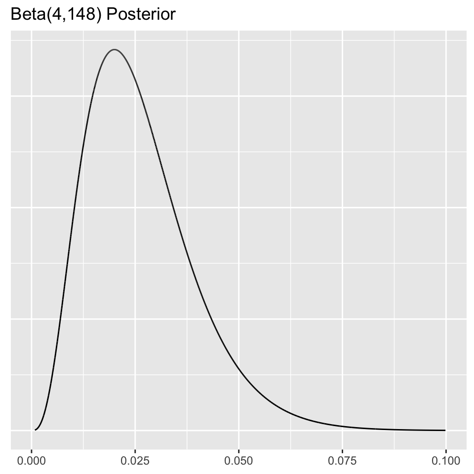 Beta(1,1) prior with 3 successes and 147 failures yields a Beta(1+3,1+147)=Beta(4,148) posterior, and the posterior mean estimate of the probability of a tumor in this group is \(\frac{4}{148+4}=\frac{4}{152}=0.026\).