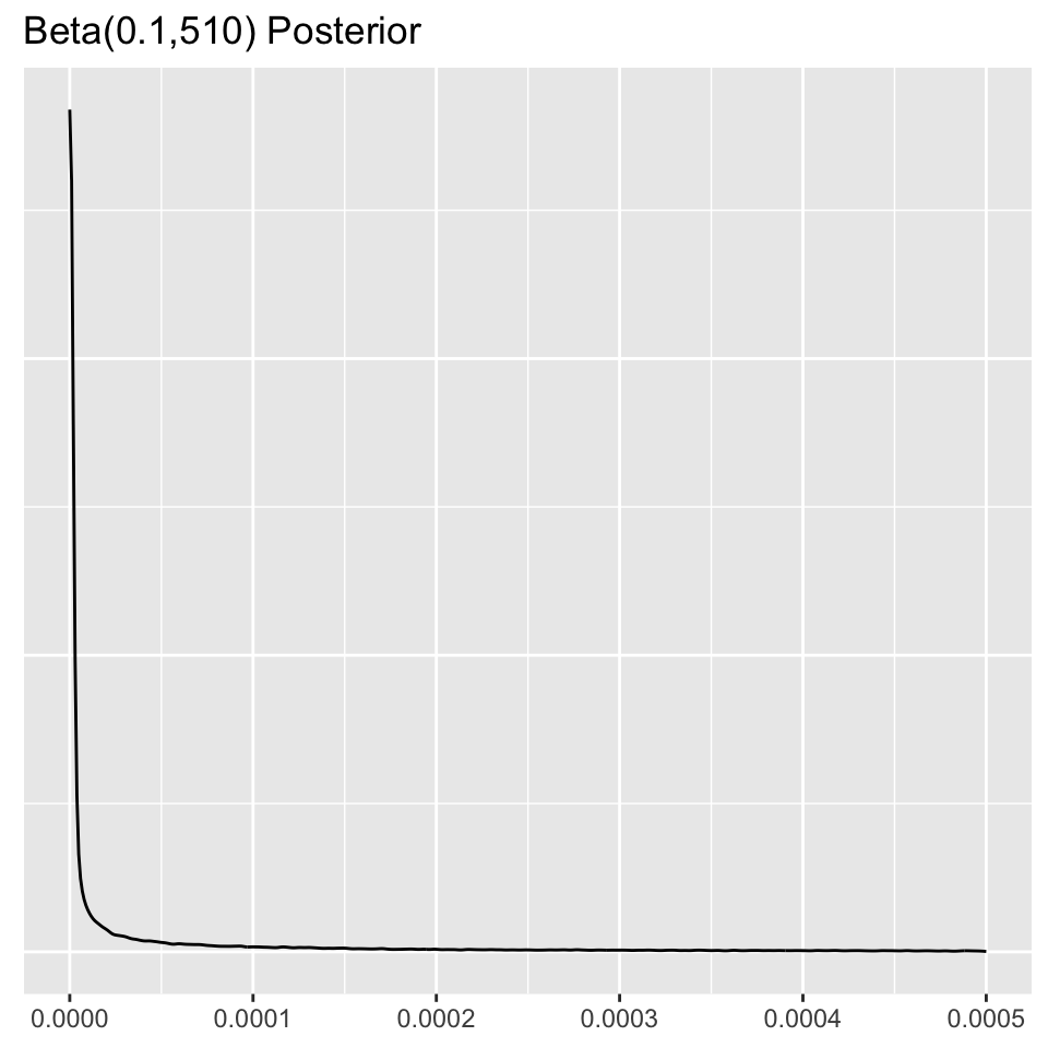 Beta(0.1,460) prior with 0 successes and 50 failures yields a Beta(0.1+0,460+50)=Beta(0.1,510) posterior, and the posterior mean estimate of the probability of a tumor in this group is \(\frac{0.1}{510.1}=0.0002\).