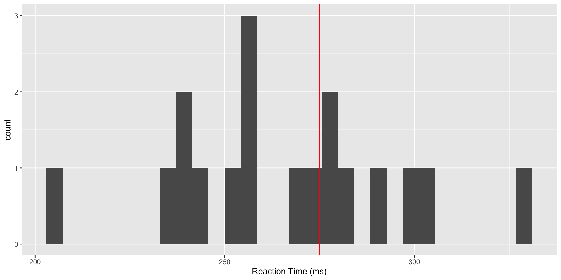 library(tidyverse)library(lme4) # lme4 package contains sleep study datadata(sleepstudy)baseline <- sleepstudy %>%filter(Days==2) # Day 2 is baseline, days 0-1 are trainingbaseline %>%ggplot(aes(x=Reaction)) +geom_histogram() +labs(x="Reaction Time (ms)") +geom_vline(xintercept=275, col="red")