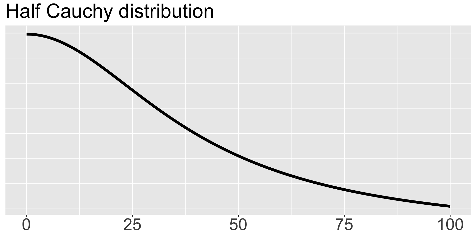 We will specify a prior directly on the standard deviation \(\sigma\) as \(\sigma \sim \text{HalfCauchy}(0,40)\), which has mean 0 and scale parameter 40 and is called “half” because only the positive values are used. If you haven’t seen the Cauchy distribution, it’s a special case of a t distribution with 1 degree of freedom, and it’s nice because it has fat tails and allows substantial mass away from its mean. We plot it here.