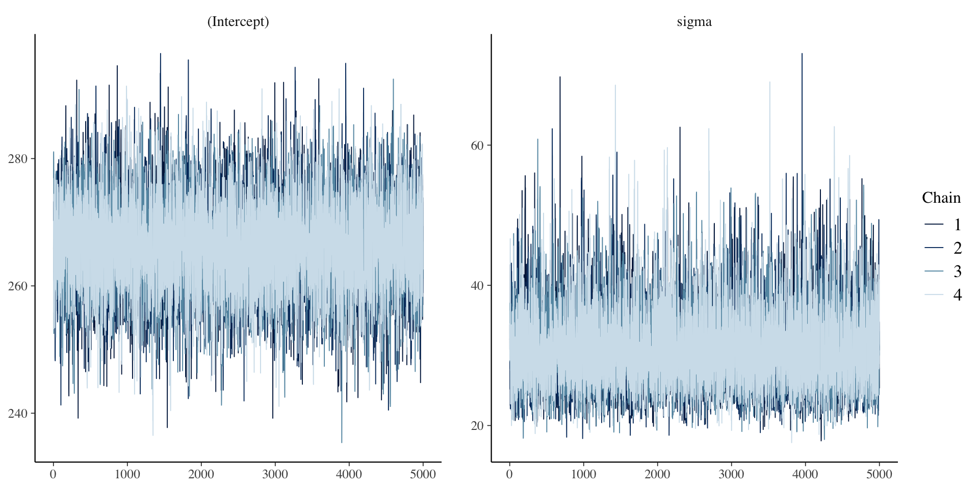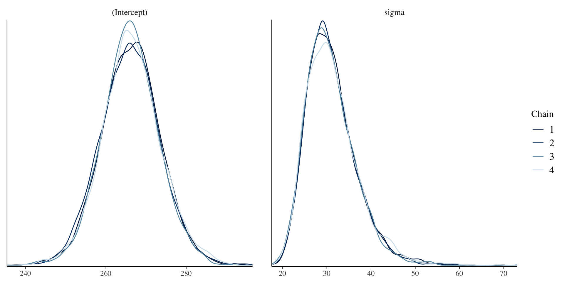 fit <-stan_glm(data = baseline, family = gaussian, Reaction ~1, #only estimating a mean (Intercept) and varianceprior_intercept =normal(300, 50),# prior for mu has mean 300 and sd 50prior_aux =cauchy(0, 40),# prior for sigma is half of a center 0, scale 40 Cauchychains =4, iter =5000*2, seed =84735, refresh =FALSE)