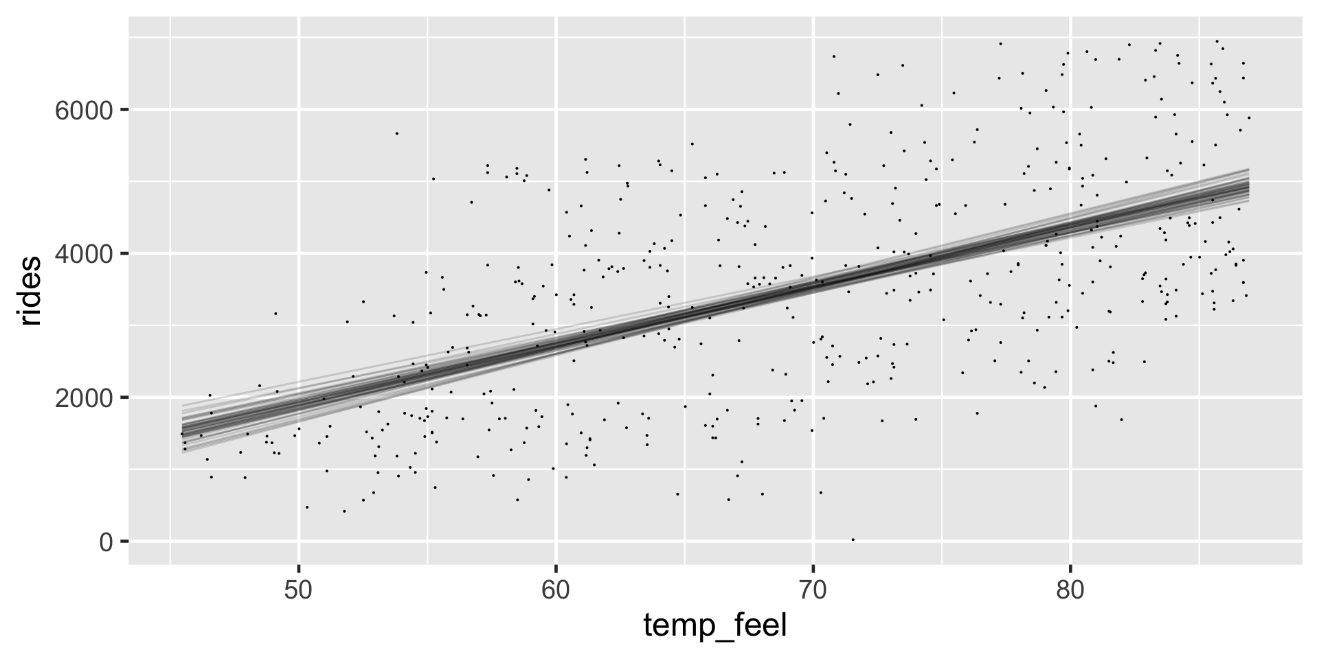 Visual evidence In our visual examination of 50 posterior plausible scenarios for the relationship between ridership and temperature, all exhibited positive associations.
