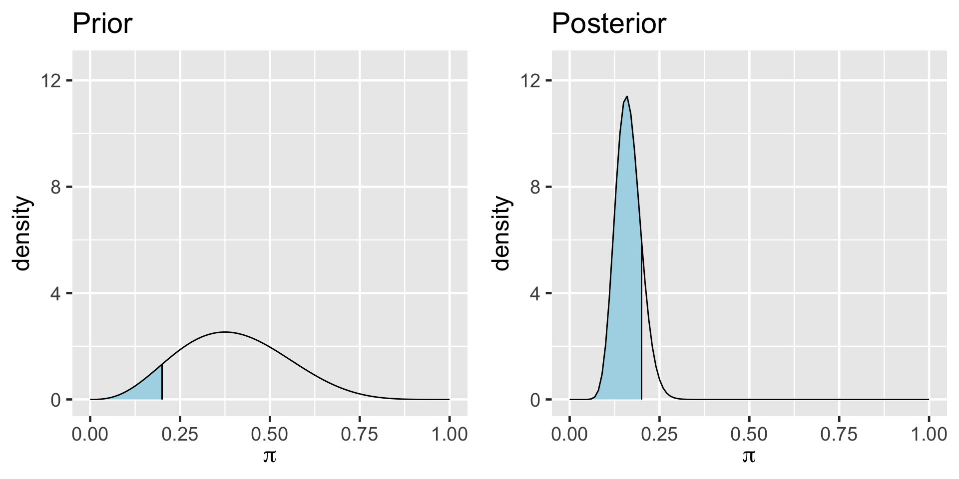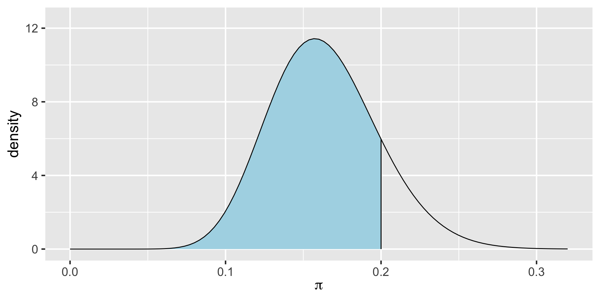 \[P((\pi < 0.20) \; | \; (Y = 14)) = 0.8489856 \;.\]
