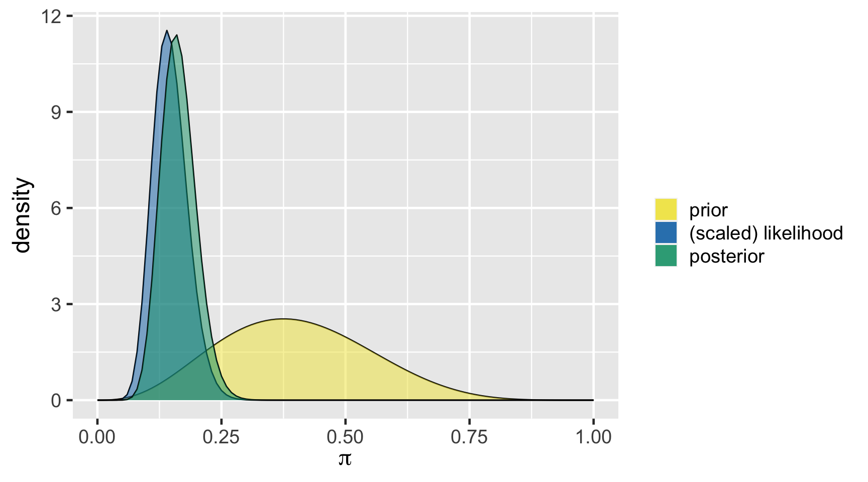 \[\begin{split} Y | \pi & \sim \text{Bin}(100, \pi) \\ \pi & \sim \text{Beta}(4, 6) \\ \end{split} \;\;\;\; \Rightarrow \;\;\;\; \pi | (Y = 14) \sim \text{Beta}(18, 92)\]