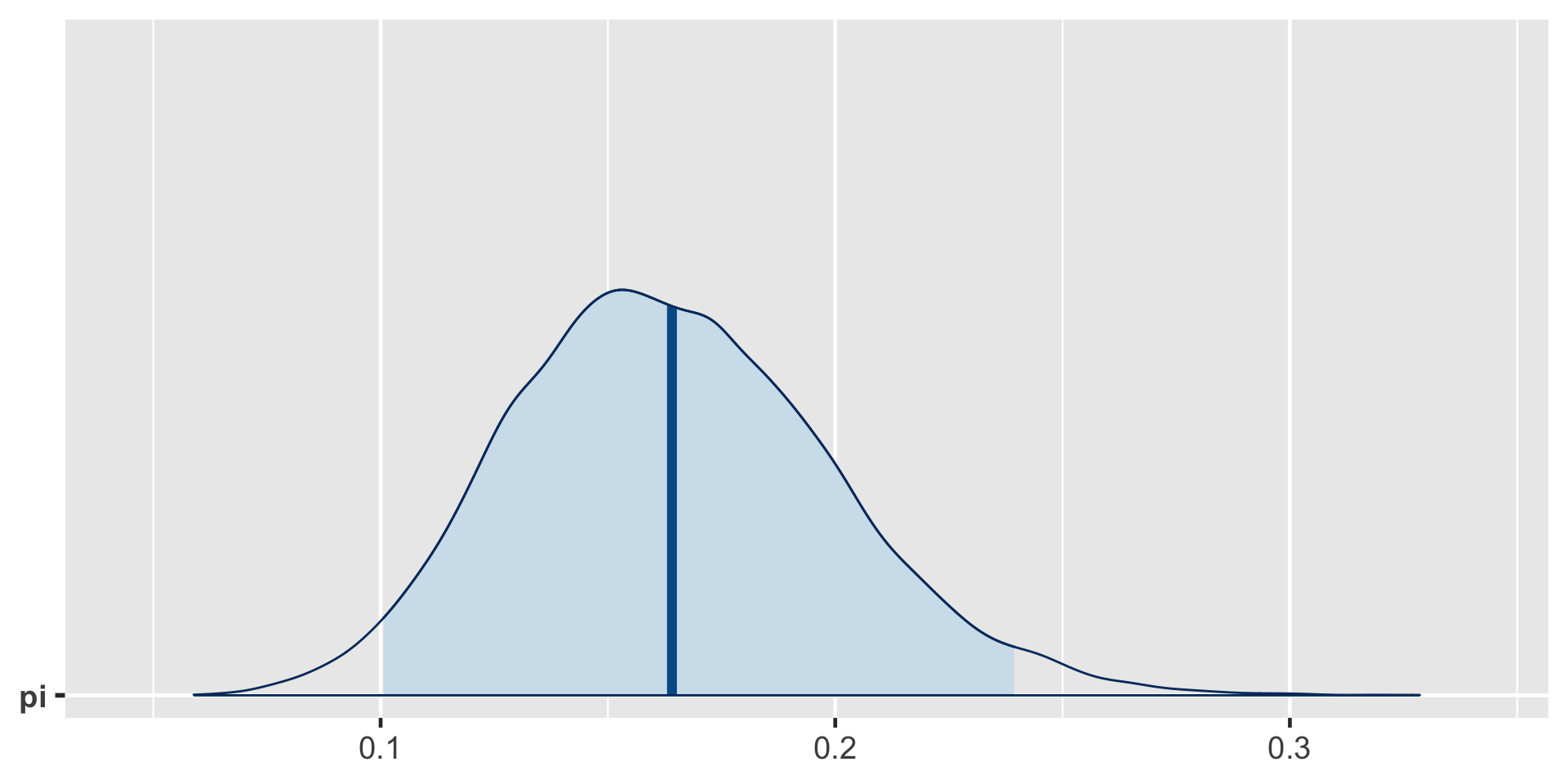\(\int_{0.1}^{0.24} f(\pi|(y=14)) d\pi \; \approx \; 0.95\)