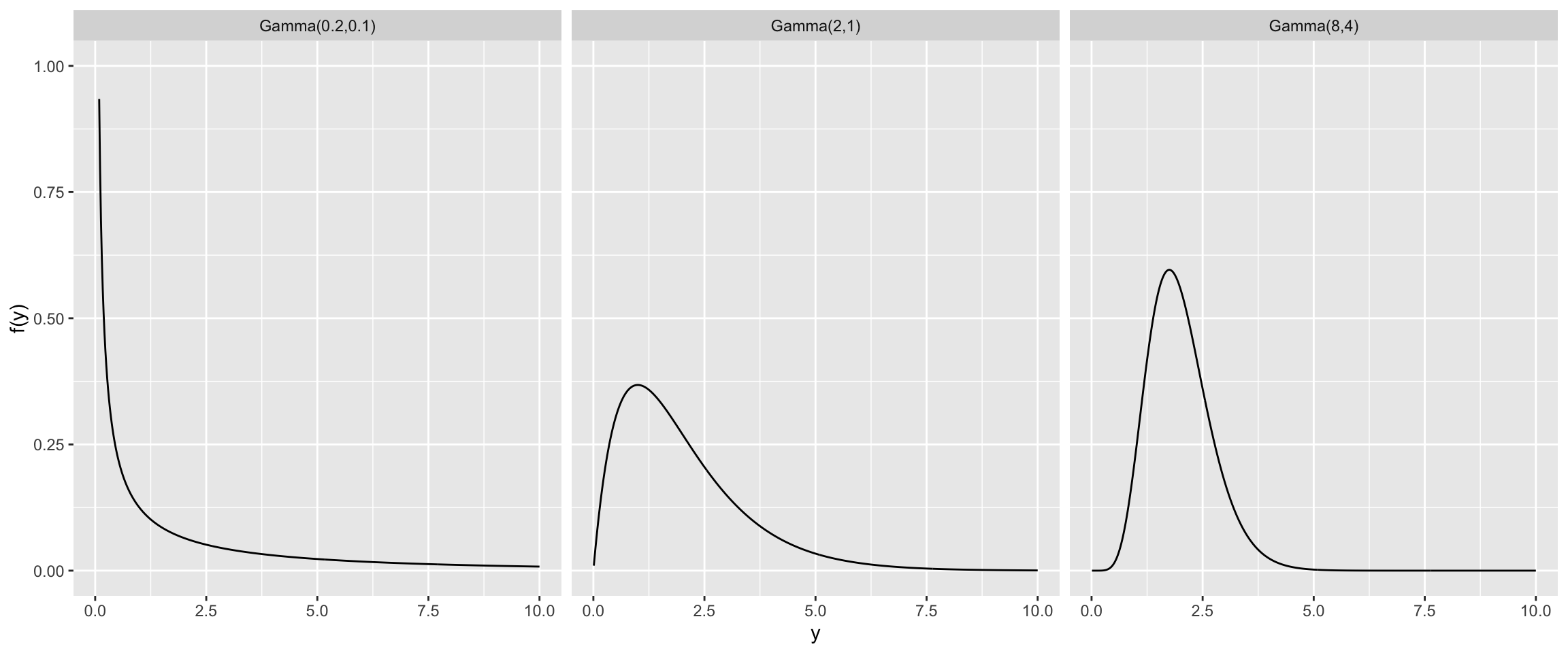 The gamma distribution is parameterized in terms of a shape parameter \(\alpha\) and rate parameter \(\beta\) and has mean \(\frac{\alpha}{\beta}\) and variance \(\frac{\alpha}{\beta^2}\).