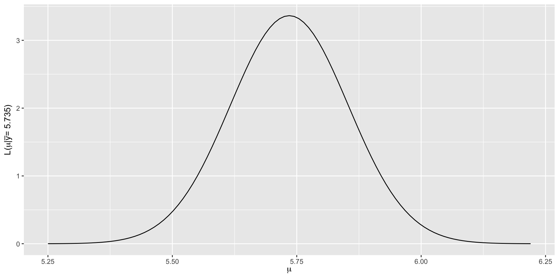 \[L(\mu | \overrightarrow{y}) \propto \exp\bigg[{-\frac{(5.735-\mu)^2}{2(0.593^2/25)}}\bigg] \;\;\;\; \text{ for } \; \mu \in (-\infty, \infty),\]