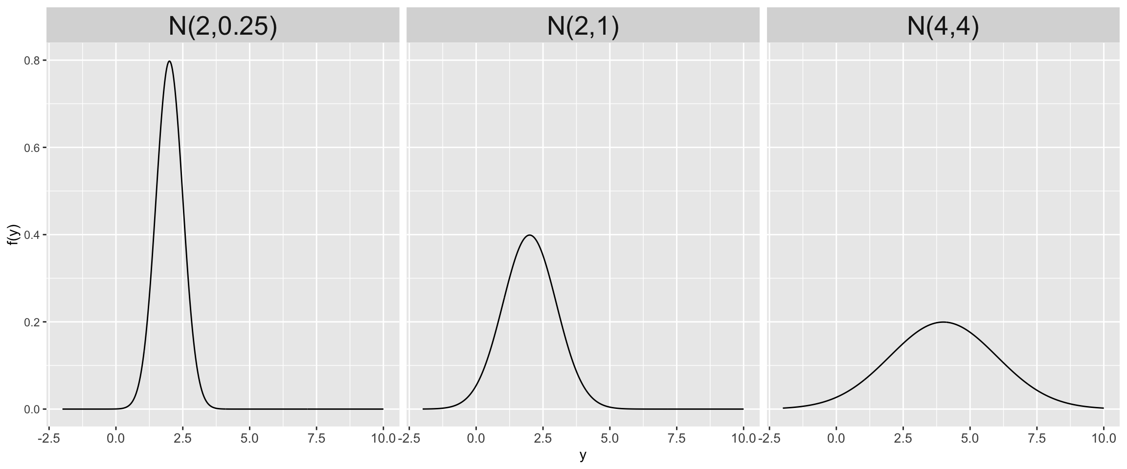 \[\begin{equation} f(y) = \frac{1}{\sqrt{2\pi\sigma^2}} \exp\bigg[{-\frac{(y-\mu)^2}{2\sigma^2}}\bigg] \;\; \text{ for } y \in (-\infty,\infty) \end{equation}\]