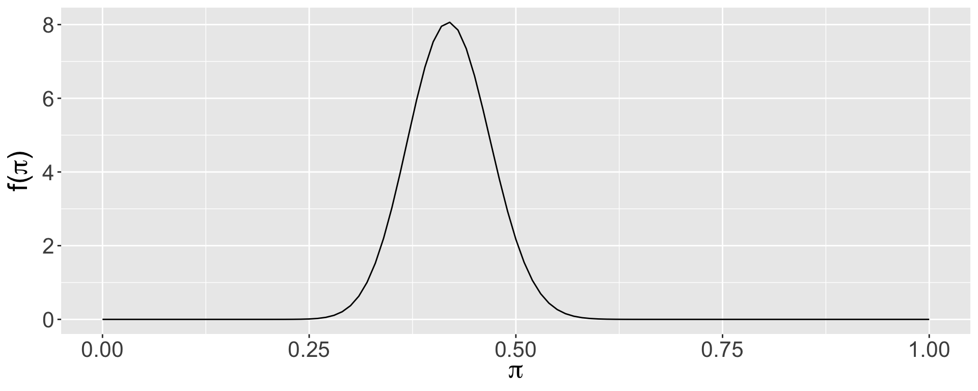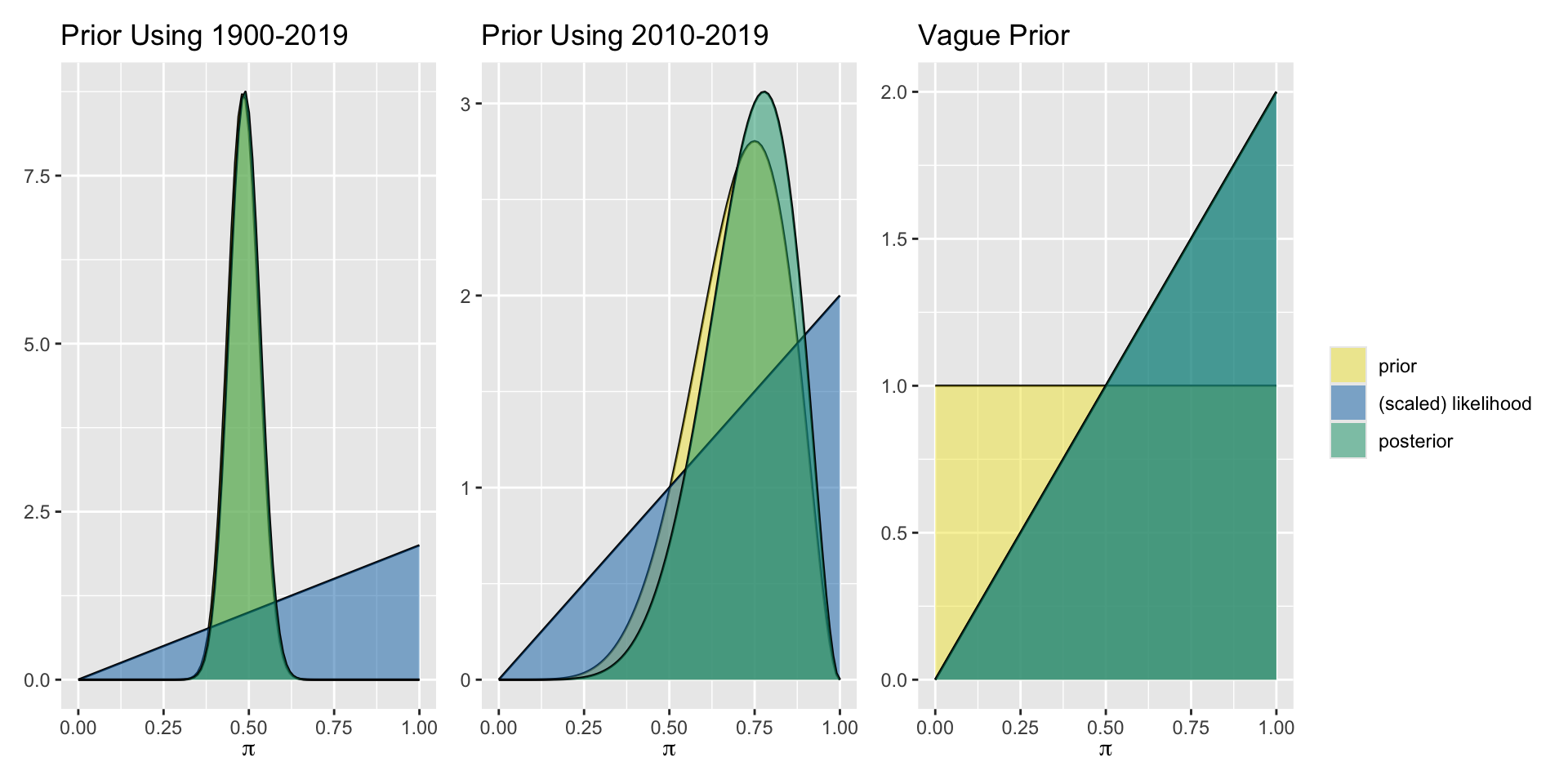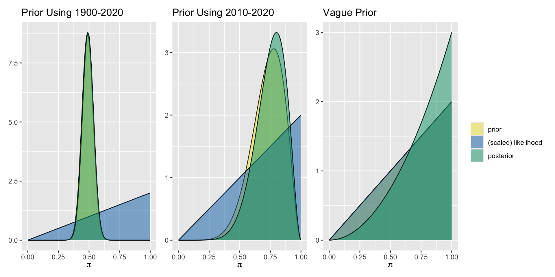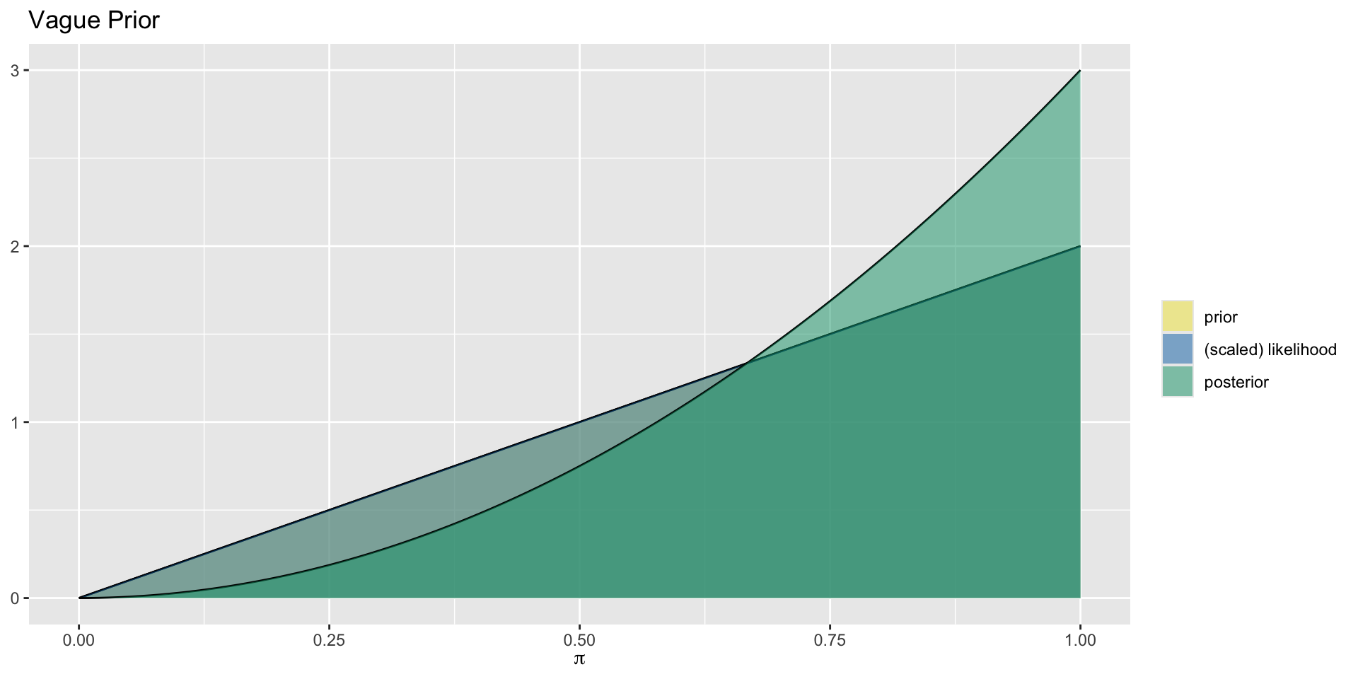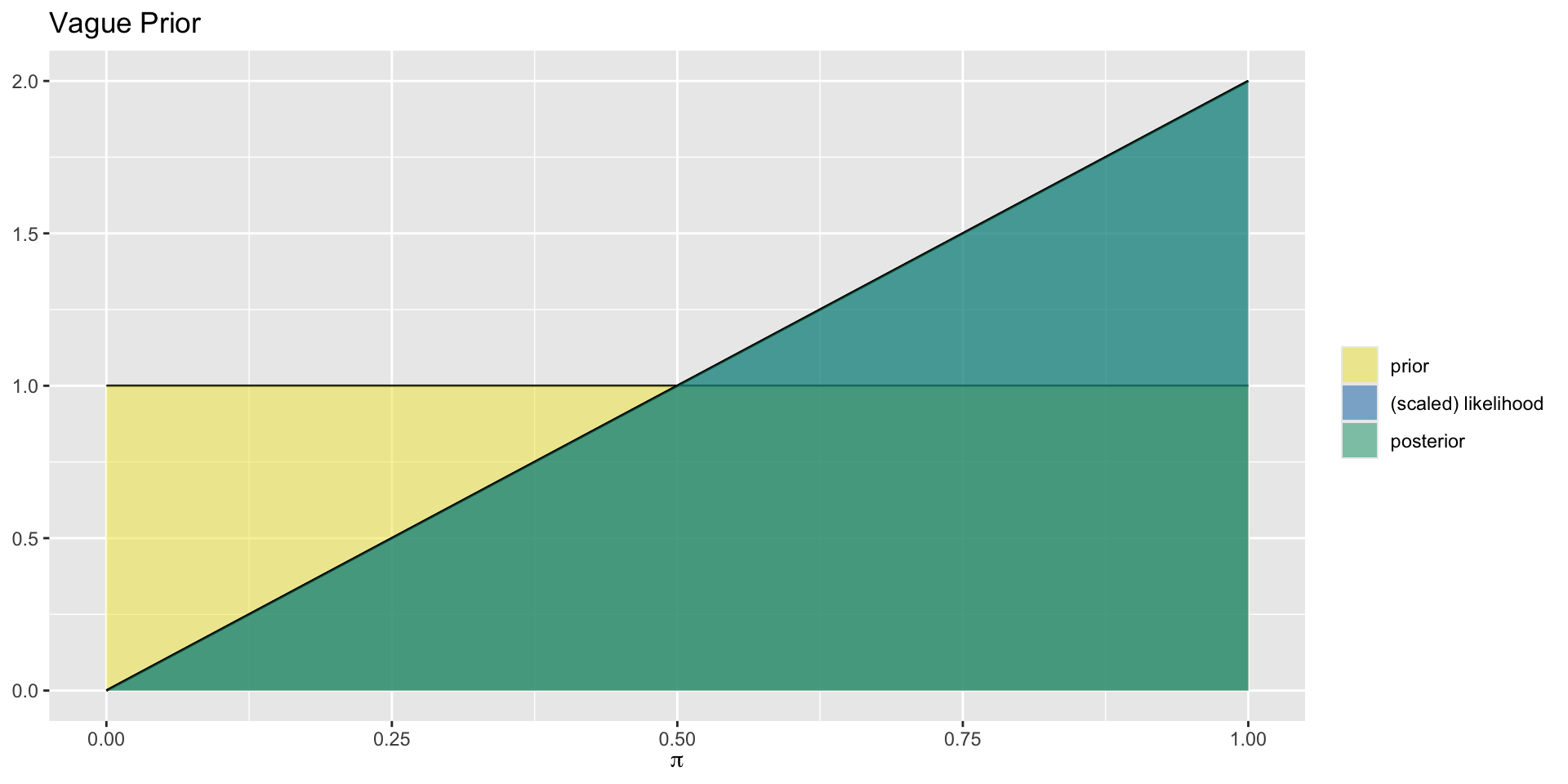 In this case, the prior Beta(2,1) is proportional to \(\pi^{2-1}(1-\pi)^{1-1}=\pi\), and the likelihood is also proportional to \(\pi^1(1-\pi)^0=\pi\).