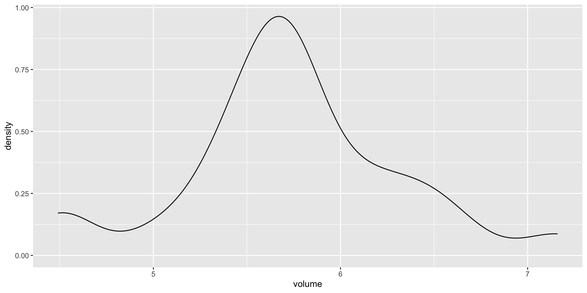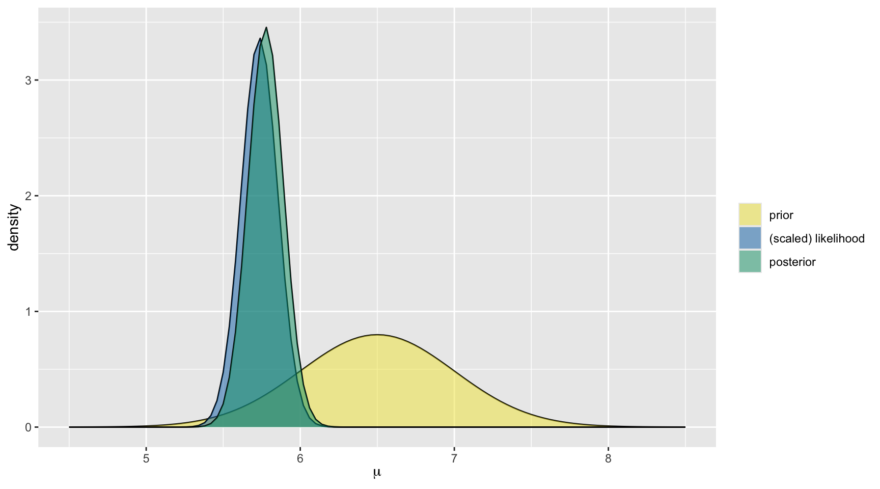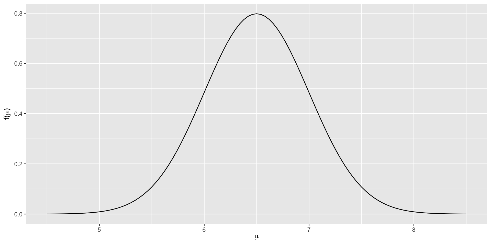 For the hippocampus data, we selected the prior \(\mu \sim N(6.5, 0.5^2)\), and recall in our dataset the mean was 5.735 and sd was 0.593.