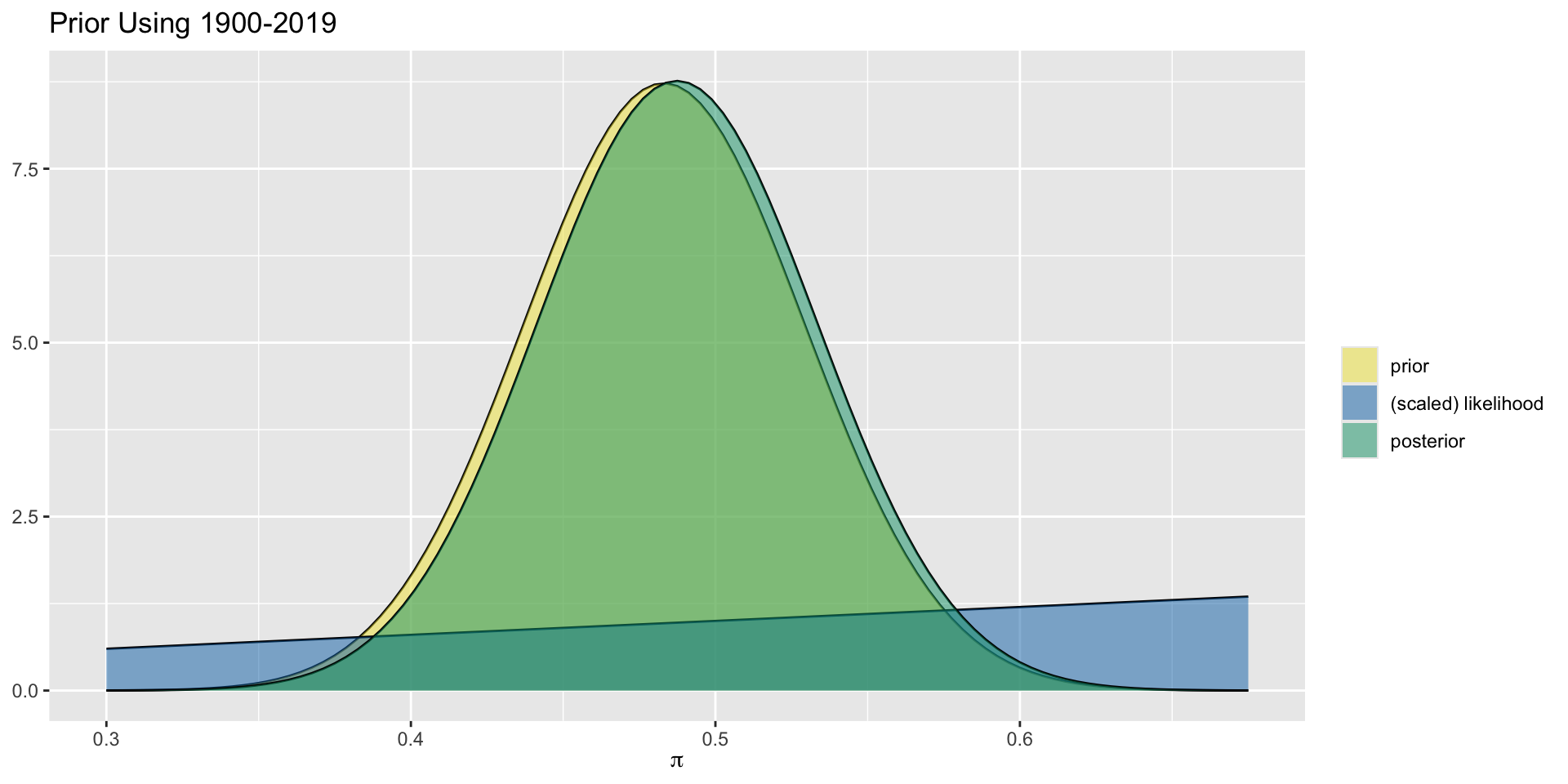 For the more informative prior, using 120 years of historical data, the prior and posterior are not exactly the same but are very close. We can focus in more closely to see the slight difference.