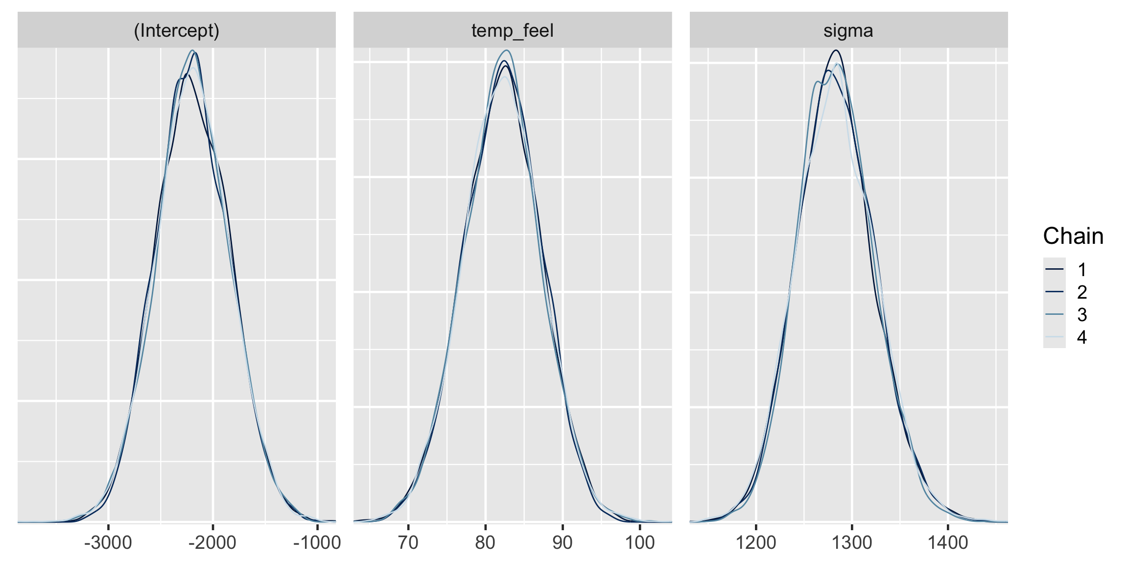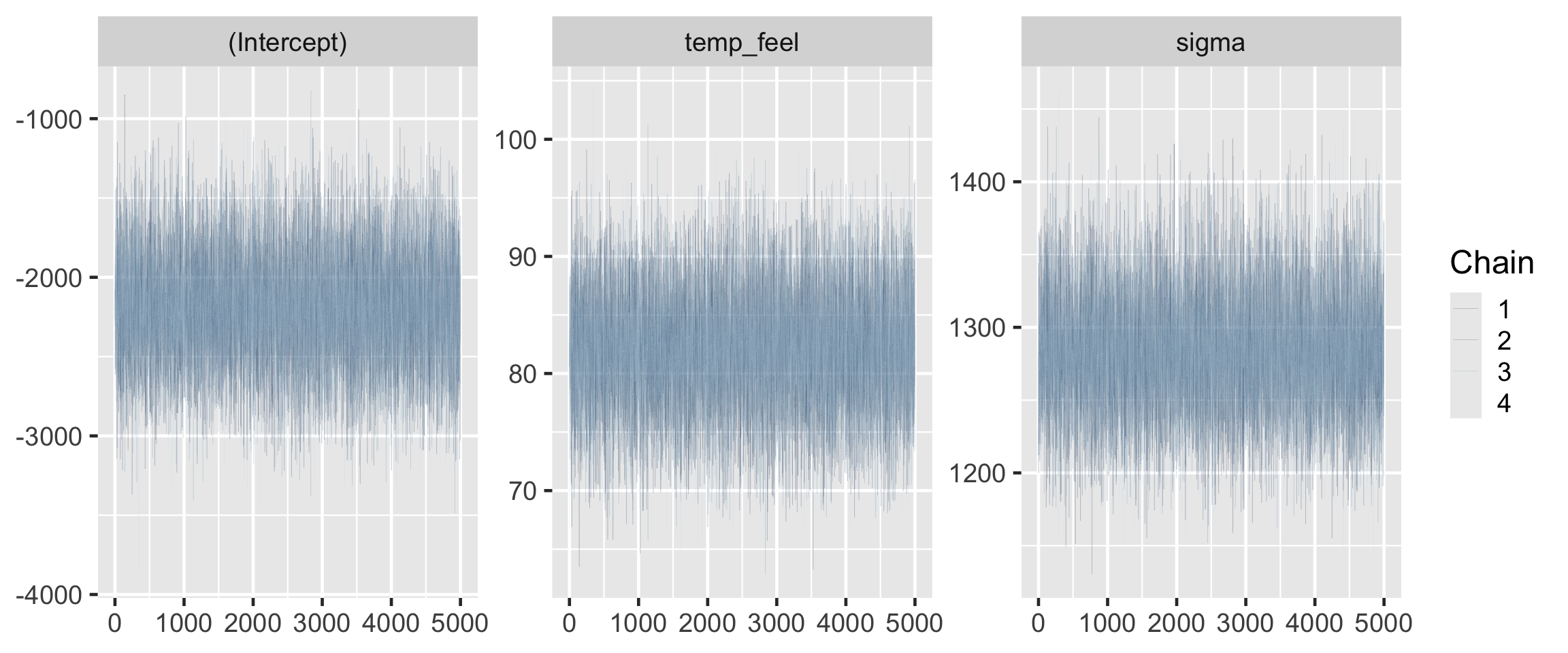 Now, we don’t actually have a nice, tidy formula for the posterior pdf of our regression parameters, \(f(\beta_0,\beta_1,\sigma|\vec{y})\), and thus can’t get a nice tidy formula for the posterior predictive pdf \(f\left(y_{\text{new}} | \vec{y}\right)\). What we do have is 20,000 sets of parameters in the Markov chain \(\left(\beta_0^{(i)},\beta_1^{(i)},\sigma^{(i)}\right)\). We can then approximate the posterior predictive model for \(Y_{\text{new}}\) at \(X = 75\) by simulating a ridership prediction from the Normal model evaluated each parameter set: