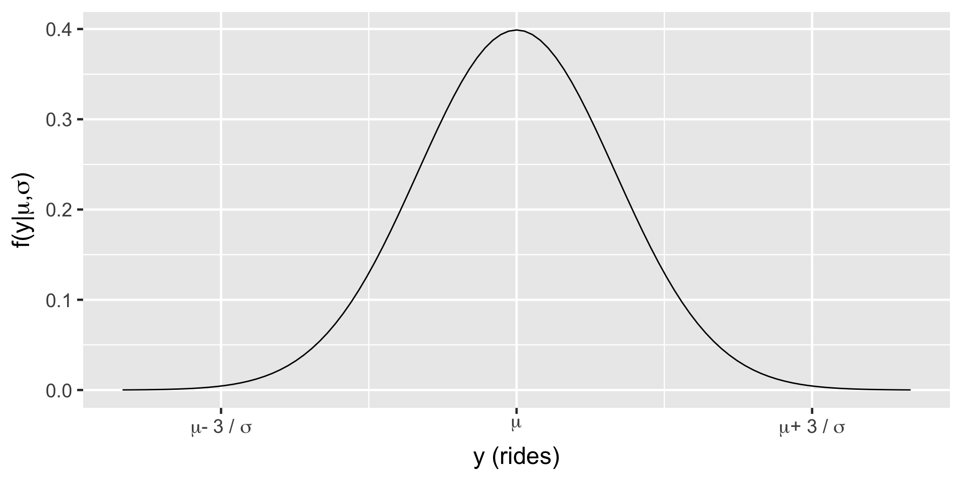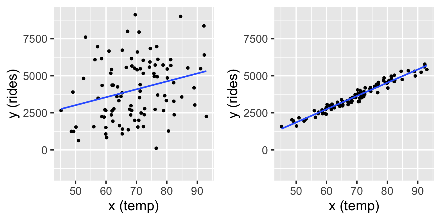 The observed ridership outcomes, \(Y\), typically deviate from the model line. That is, we don’t expect every 75-degree day to have the same exact number of rides.