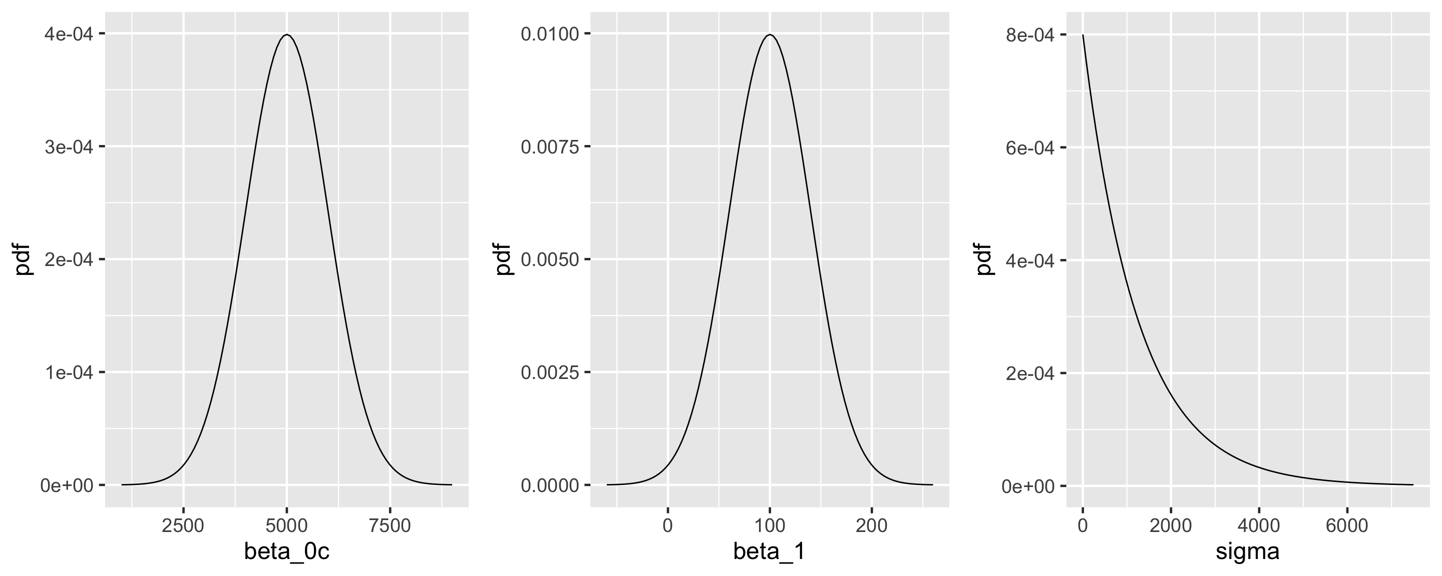 \[\begin{split} Y_i | \beta_0, \beta_1, \sigma & \stackrel{ind}{\sim} N\left(\mu_i, \sigma^2\right) \;\; \text{ with } \;\; \mu_i = \beta_0 + \beta_1X_i \\ \beta_{0c} & \sim N\left(5000, 1000^2 \right) \\ \beta_1 & \sim N\left(100, 40^2 \right) \\ \sigma & \sim \text{Exp}(0.0008) .\\ \end{split}\]