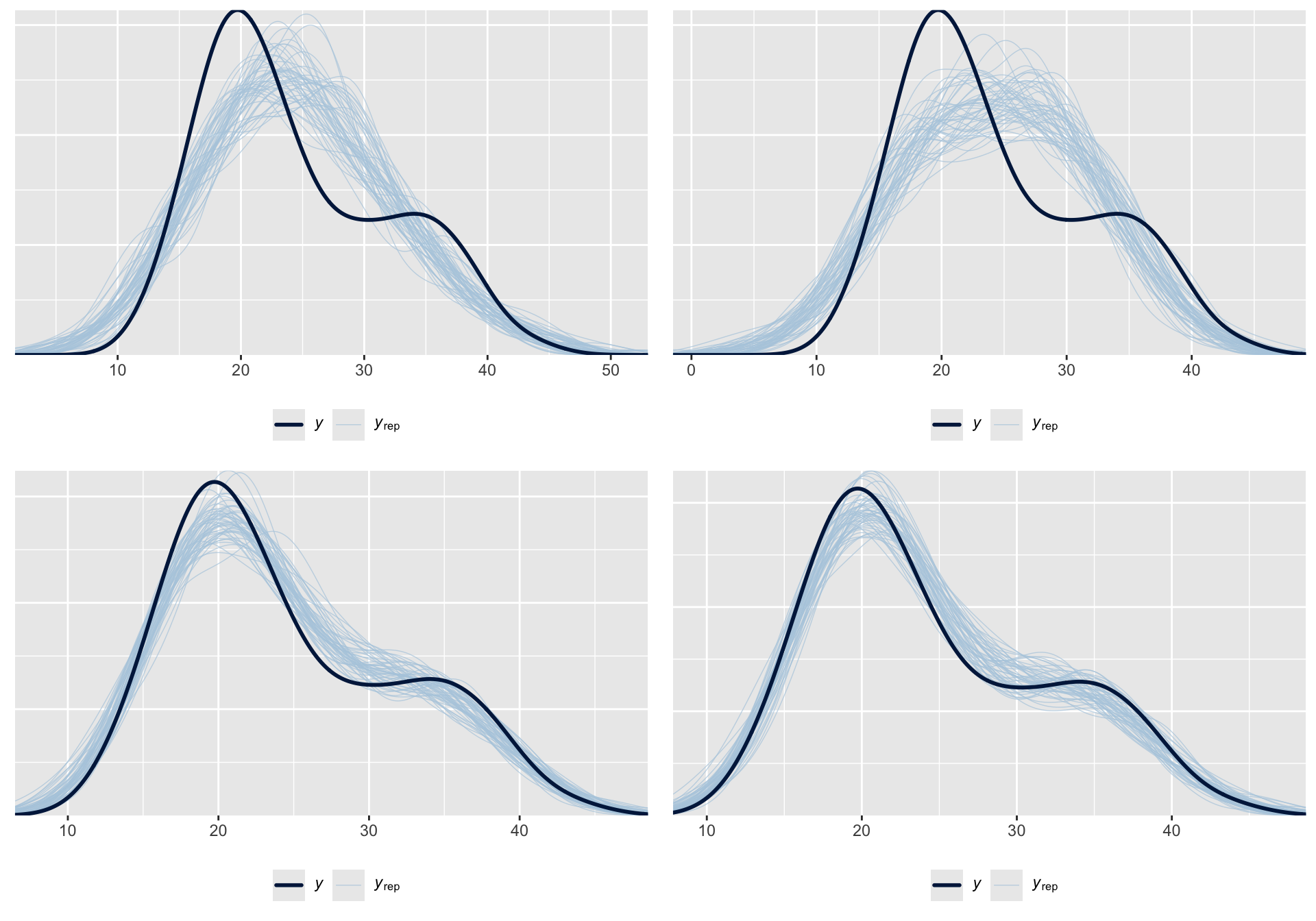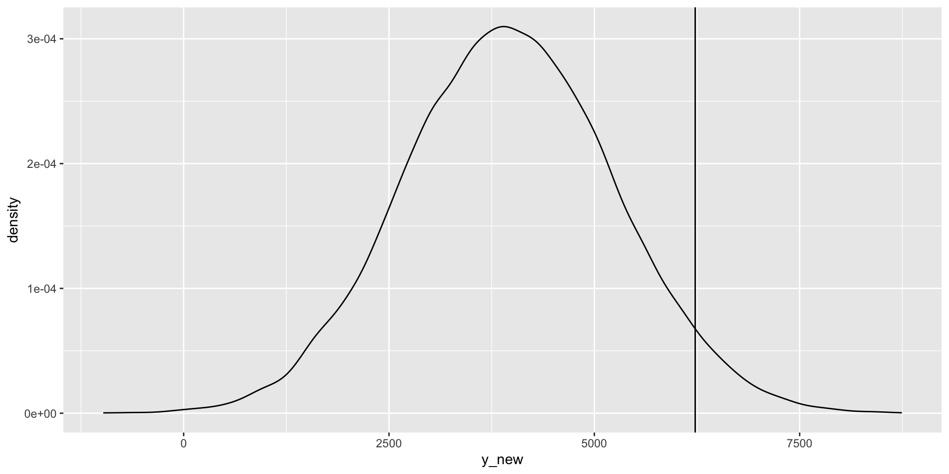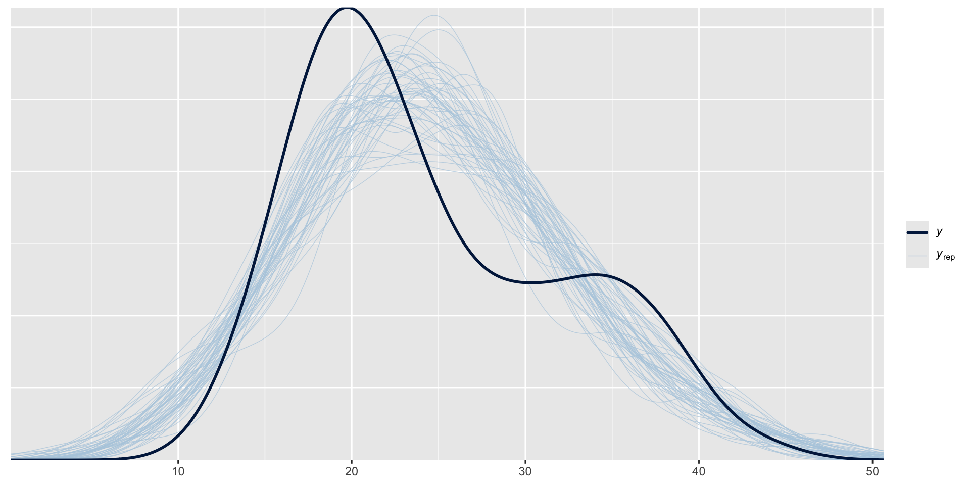 Consider a regression model with response variable \(Y\), predictor \(X\), and a set of regression parameters \(\theta\). For example, in the model in the previous slides \(\theta = (\beta_0,\beta_1,\sigma)\). Further, let \(\left\lbrace \theta^{(1)}, \theta^{(2)}, \ldots, \theta^{(N)}\right\rbrace\) be an \(N\)-length Markov chain for the posterior model of \(\theta\). Then a “good” Bayesian model will produce predictions of \(Y\) with features similar to the original \(Y\) data. To evaluate whether your model satisfies this goal: