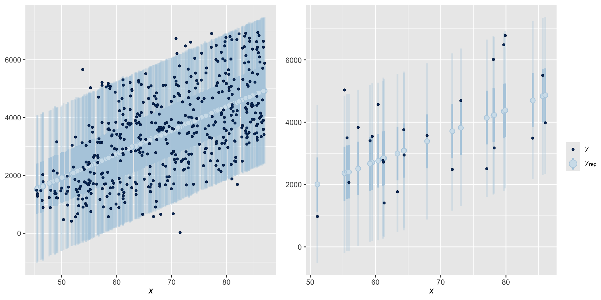 The within_50 statistic measures the proportion of observed values \(Y_i\) that fall within their 50% posterior prediction interval. The within_95 statistic is similar, but for 95% posterior prediction intervals.