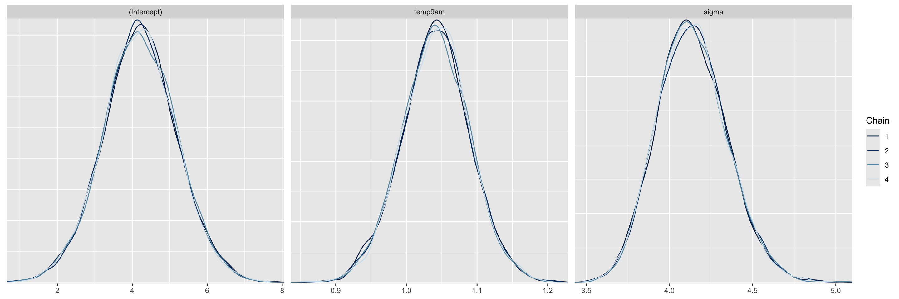 slope = temp9am), color = "blue")\(\text{likelihood model:}\) \(Y_i | \beta_0, \beta_1, \beta_2, \beta_3 \sigma \;\;\;\stackrel{ind}{\sim} N\left(\mu_i, \sigma^2\right)\text{ with }\) \(\mu_i = \beta_0 + \beta_1X_{i2} + \beta_2X_{i3} + \beta_3X_{i2}X_{i3}\)