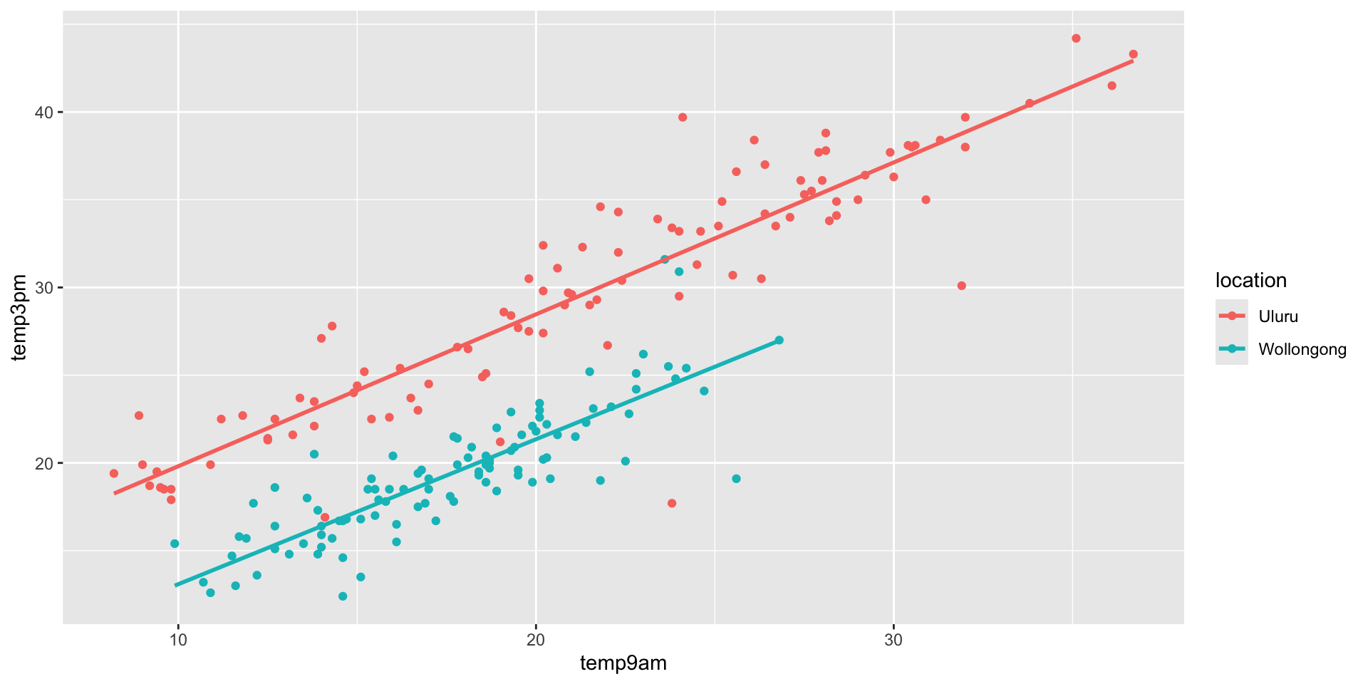 In Wollongong, \(X_{i2} = 1\) and the trend in the relationship between 3pm and 9am temperature simplifies to