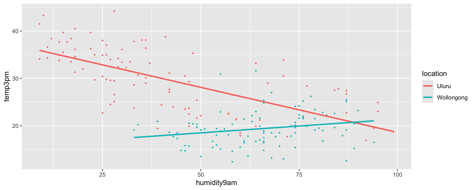 \[\begin{array}{lrl} \text{Uluru:} & \mu & = 37.594 - 0.19 \text{ humidity9am} \\ \text{Wollongong:} & \mu & = (37.594 - 21.89) + (-0.19 + 0.246) \text{ humidity9am}\\ && = 15.704 + 0.056 \text{ humidity9am}\\ \end{array}\]