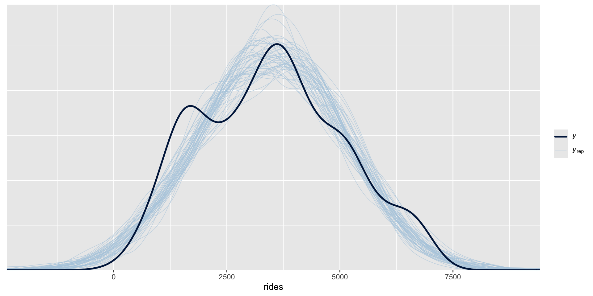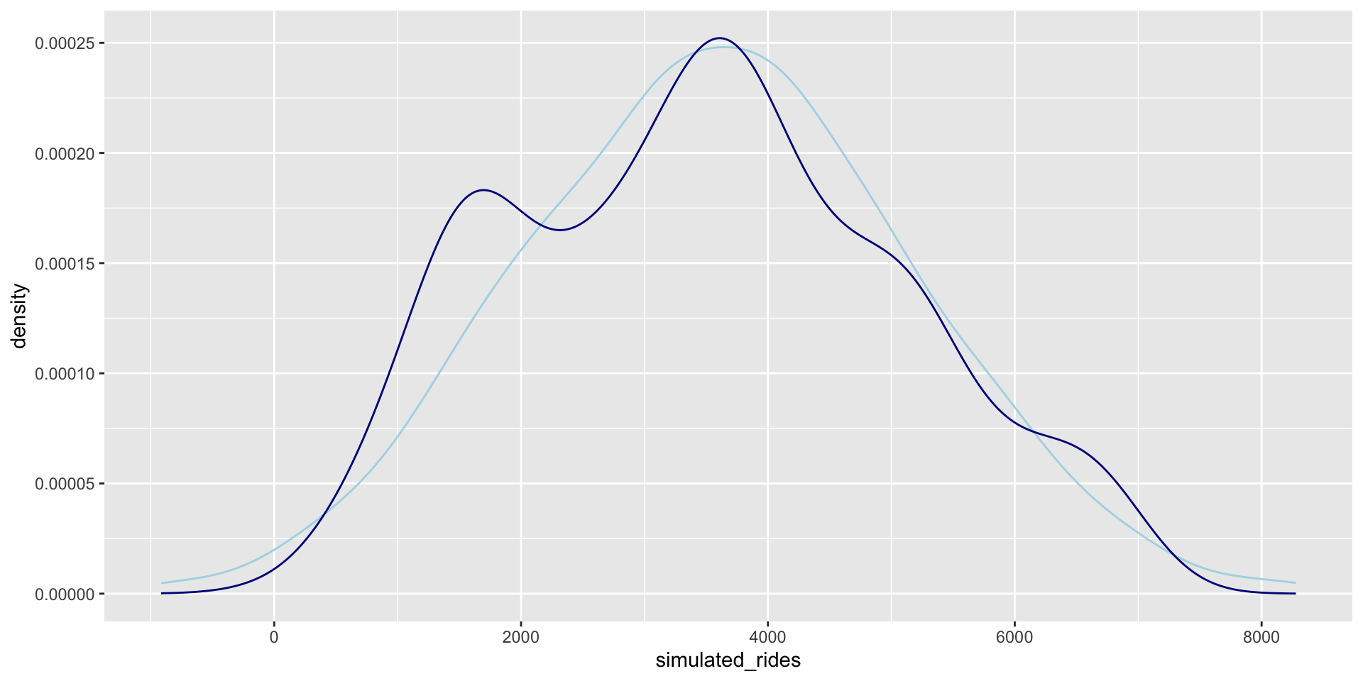 One posterior simulated dataset of ridership (light blue) along with the actual observed ridership data (dark blue)