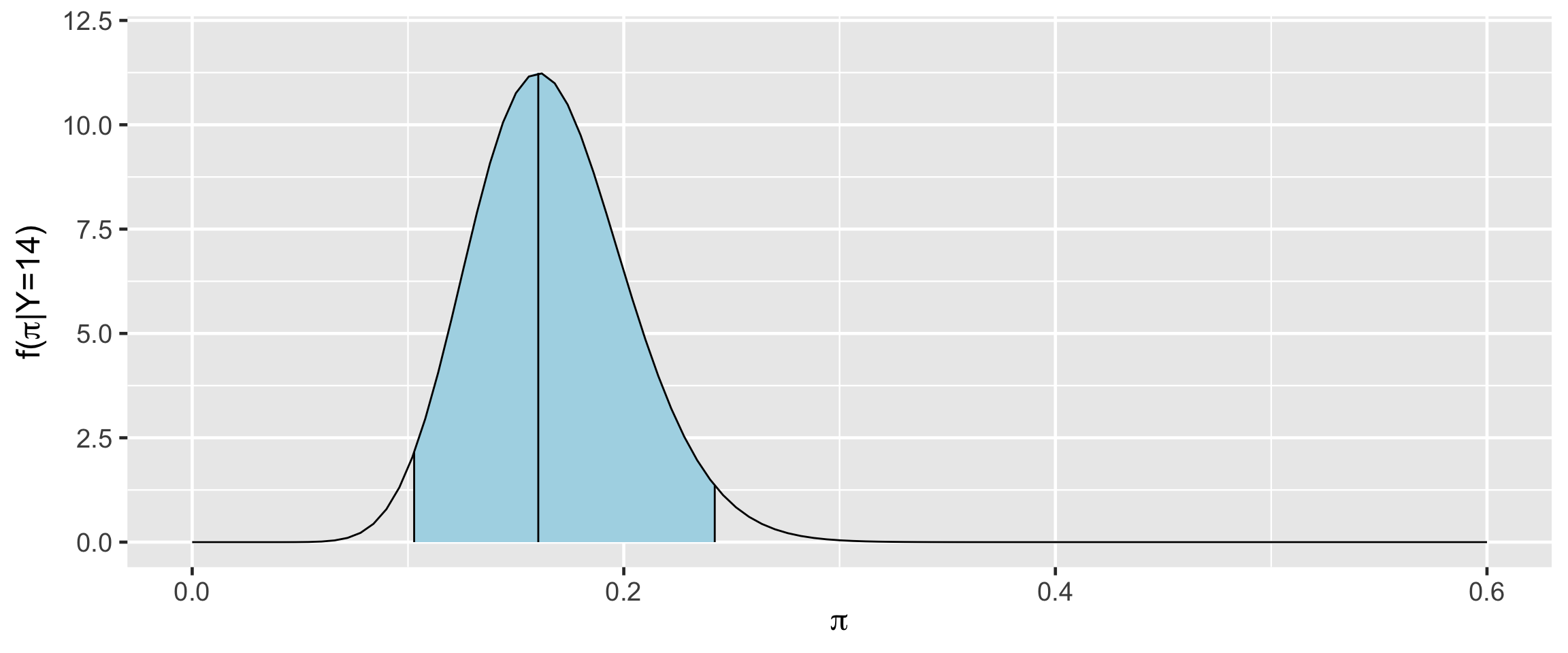 \[P((\pi < 0.20) \; | \; (Y = 14)) = 0.8489856 \;.\]
