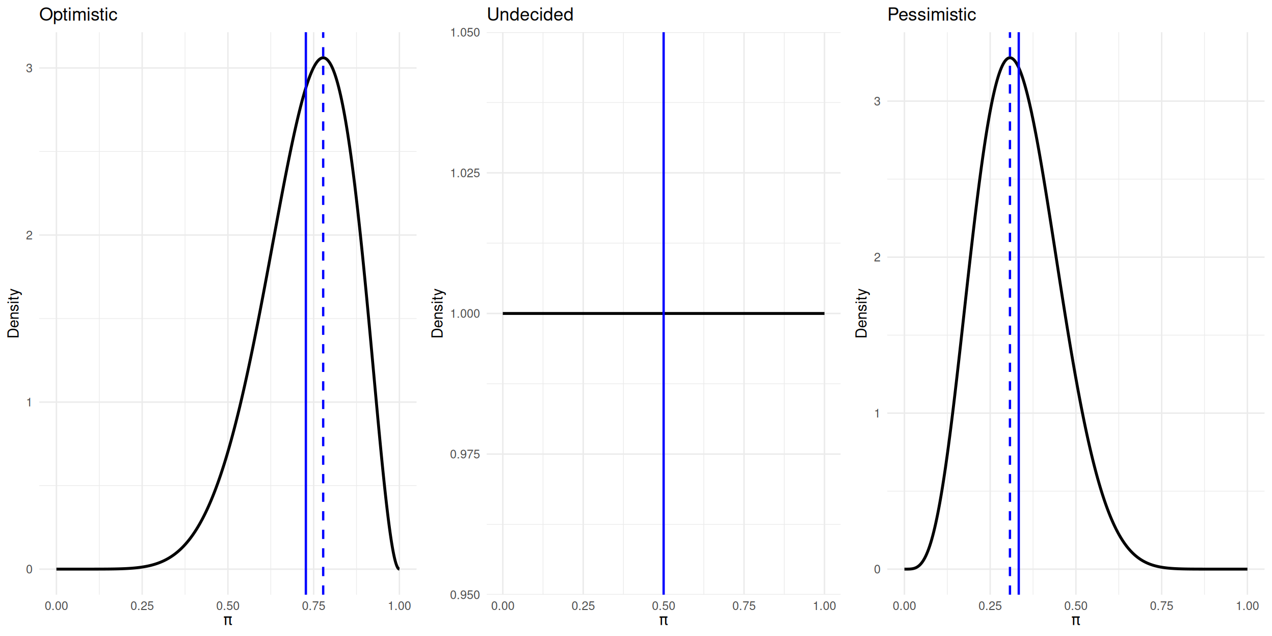 Let \(\pi\) be the proportion of correct answers a person guesses right in the CNN vs the Onion quiz. Keeping that number in mind, let’s explore in the table below, three different priors for \(\pi\)